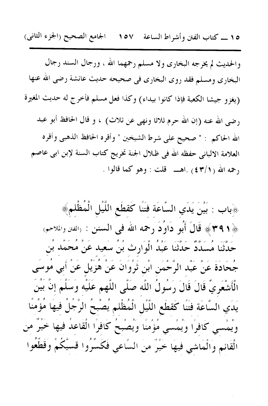 الله الحاكم: " صحيح على شرط الشيخين " وأقره الحافظ الذهبى وأقره العلامة الالبانى حفظه الله فى ظلال الجنة تخريج كتاب السنة لإبن ابى عاصم رحمه الله (1/ 43).اهـ قلت: وهو كما قالوا.