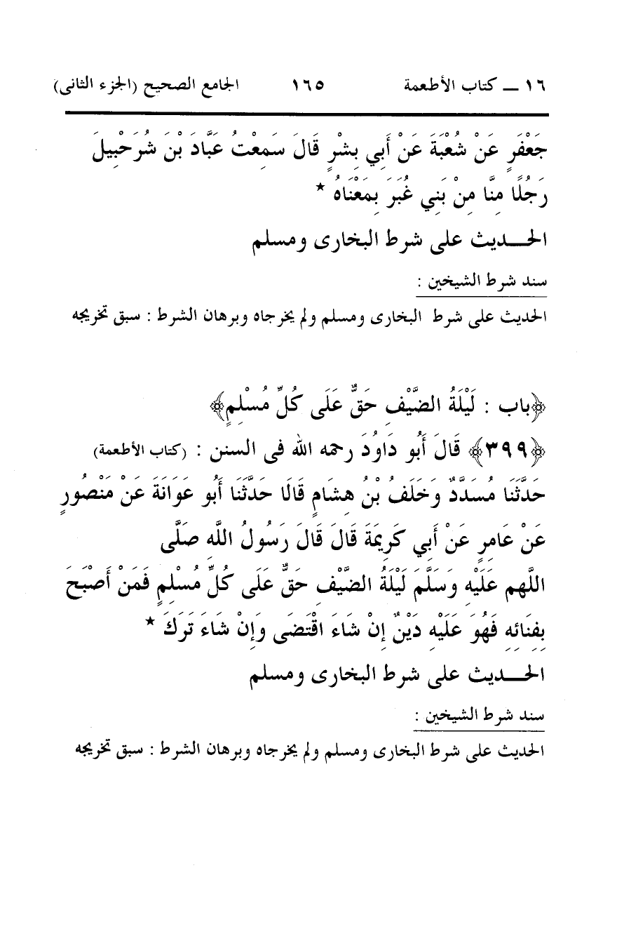 399 - قَالَ أَبُو دَاوُدَ رحمه الله فى السنن: (كتاب الأطعمة) حَدَّثَنَا مُسَدَّدٌ وَخَلَفُ بْنُ هِشَامٍ قَالَا حَدَّثَنَا أَبُو عَوَانَةَ عَنْ مَنْصُورٍ عَنْ عَامِرٍ عَنْ أَبِي كَرِيمَةَ قَالَ قَالَ رَسُولُ اللَّهِ صَلَّى