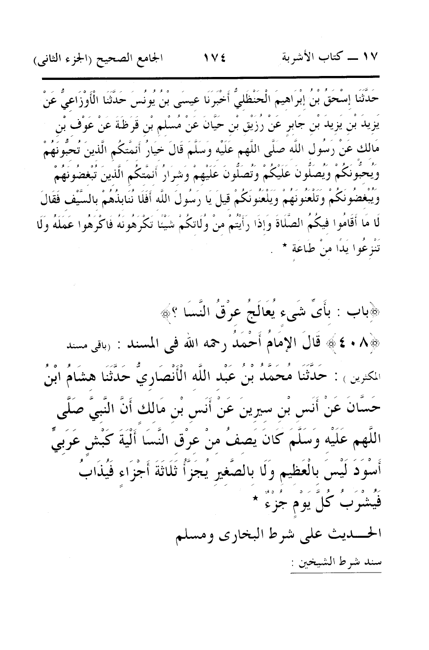 408 - قَالَ الإمَامُ أَحْمَدُ رحمه الله فى المسند: (باقى مسند المكثرين): حَدَّثَنَا مُحَمَّدُ بْنُ عَبْدِ اللَّهِ الْأَنْصَارِيُّ حَدَّثَنَا هِشَامُ ابْنُ حَسَّانَ عَنْ أَنَسِ بْنِ سِيرِينَ عَنْ أَنَسِ بْنِ مَالِكٍ أَنَّ النَّبِيَّ صَلَّى اللَّهم عَلَيْهِ وَسَلَّمَ كَانَ يَصِفُ مِنْ عِرْقِ النَّسَا أَلْيَةَ كَبْشٍ عَرَبِيٍّ أَسْوَدَ لَيْسَ بِالْعَظِيمِ وَلَا بِالصَّغِيرِ يُجَزَّأُ ثَلَاثَةَ أَجْزَاءٍ فَيُذَابُ فَيُشْرَبُ كُلَّ يَوْمٍ جُزْءٌ *