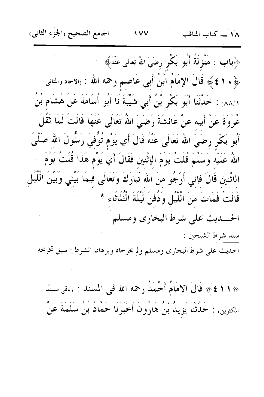 410 - قَالَ الإمَامُ ابْنُ أَبِى عَاصِمٍ رحمه الله: (الاحاد والمثانى 1/ 88): حَدَّثَنَا أَبُو بَكْرِ بْنُ أَبِي شَيْبَةَ نَا أَبُو أُسَامَةَ عَنْ هُشَامِ بْنُ عُرْوَةَ عَنْ أَبِيهِ عَنْ عَائشَةَ رَضَيَ اللهُ تَعَالَى عَنْهَا قَالَتْ لَمَا ثَقُلَ أَبُو بَكْرٍ رِضَيَ اللهُ تَعَالَى عَنْهُ قَالَ أَي يَوْمٍ تُوُّفِيَ رَسُّولَ اللهِ صَلَّىَ اللهُ عَلَيْهِ وَسَلَّمَ قُلْتُ يَوْمَ الِإثْنِينِ فَقَالَ أَي يَوْمٍ هَذَا قُلْتُ يَوْمَ الِإثْنِينِ قَالَ فِإنِي أَرْجُو مِنَ اللهِ تَبَارَكَ وَتَعَالَى فِيمَا بَيْنِي وَبَيْنَ الْلَّيْلِ قَالَتْ فَمَاتَ مِنَ الْلَّيْلِ وَدُفِنَ لَيْلَةَ الْثُلَاثَاءِ *