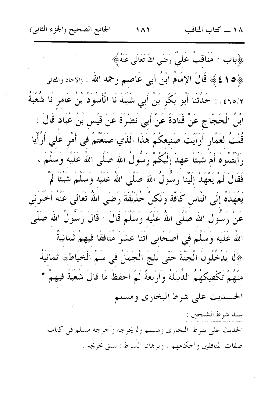 415 - قَالَ الإمَامُ ابْنُ أبِى عَاصِم رحمه الله: (الاحاد والمثانى 2/ 465): حَدَّثَنَا أَبُو بَكْرٍ بْنُ أَبِي شَيْبَةَ نَا الْأَسْوَدُ بْنُ عَامِرٍ نَا شُعْبَةُ ابْنُ الْحَجَّاجِ عَنْ قَتَادَةَ عَنْ أَبِي نَضْرَةَ عَنْ قَيْسِ بْنُ عُبَادٍ قَالَ: