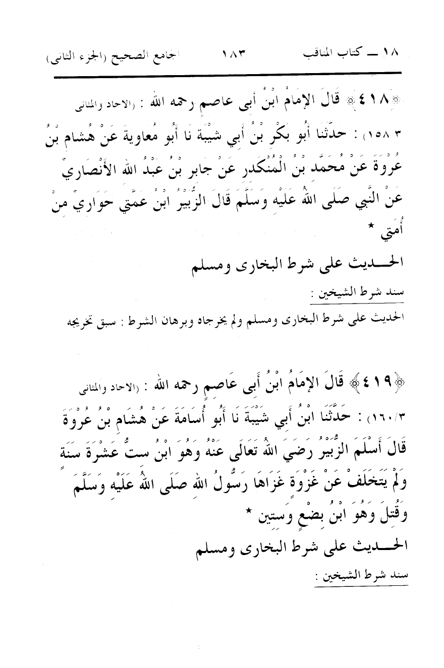 418 - قَالَ الإمَامُ ابْنُ أَبِى عَاصِمٍ رحمه الله: (الاحاد والمثانى 3/ 158): حَدَّثَنَا أَبُو بَكْرِ بْنُ أَبِي شَيْبَةَ نَا أَبُو مُعَاويةَ عَنْ هُشَامِ بْنُ عُرْوَةَ عَنْ مُحَمَّدِ بْنُ الْمُنْكَدِرِ عَنْ جَابِر بْنُ عَبْدُ اللهِ الأَنْصَاريِّ عَنْ النَّبي صَلَى اللهُ عَلَيْهِ وَسَلَّمَ قَالَ الزُّبَيْرُ ابْنُ عَمَّتي حَوَارِيِّ مِنْ أُمَتي *