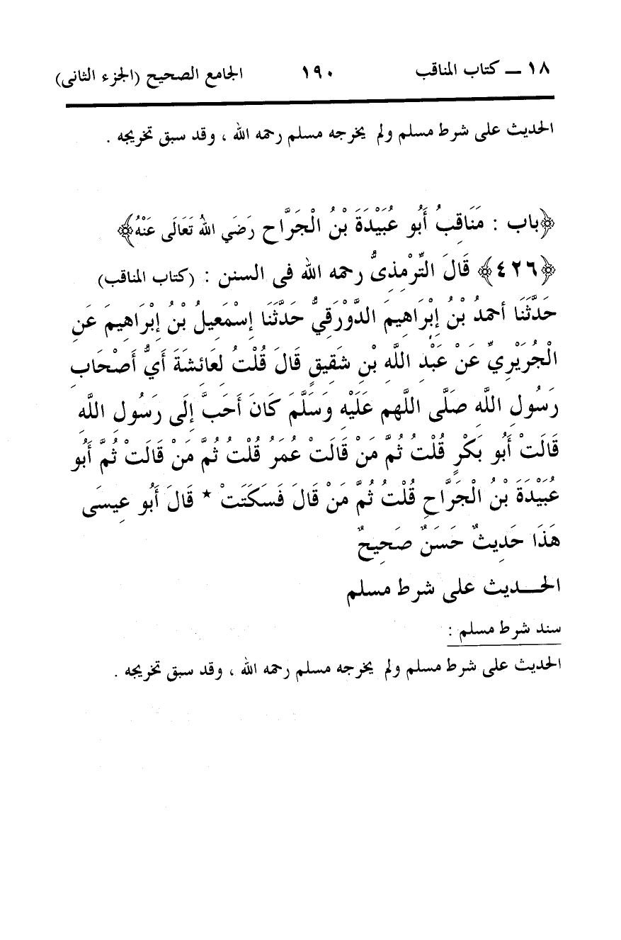 426 - قَالَ التِّرْمِذِىُّ رحمه الله فى السنن: (كتاب المناقب) حَدَّثَنَا أحمدُ بْنُ إِبْرَاهِيمَ الدَّوْرَقِيُّ حَدَّثَنَا إِسْمَعِيلُ بْنُ إِبْرَاهِيمَ عَنِ الْجُرَيْرِيِّ عَنْ عَبْدِ اللَّهِ بْنِ شَقِيقٍ قَالَ قُلْتُ لِعَائِشَةَ أَيُّ أَصْحَابِ رَسُولِ اللَّهِ صَلَّى اللَّهم عَلَيْهِ وَسَلَّمَ كَانَ أَحَبَّ إِلَى رَسُولِ اللَّهِ قَالَتْ أَبُو بَكْرٍ قُلْتُ ثُمَّ مَنْ قَالَتْ عُمَرُ قُلْتُ ثُمَّ مَنْ قَالَتْ ثُمَّ أَبُو عُبَيْدَةَ بْنُ الْجَرَّاحِ قُلْتُ ثُمَّ مَنْ قَالَ فَسَكَتَتْ * قَالَ أَبُو عِيسَى هَذَا حَدِيثٌ حَسَنٌ صَحِيحٌ