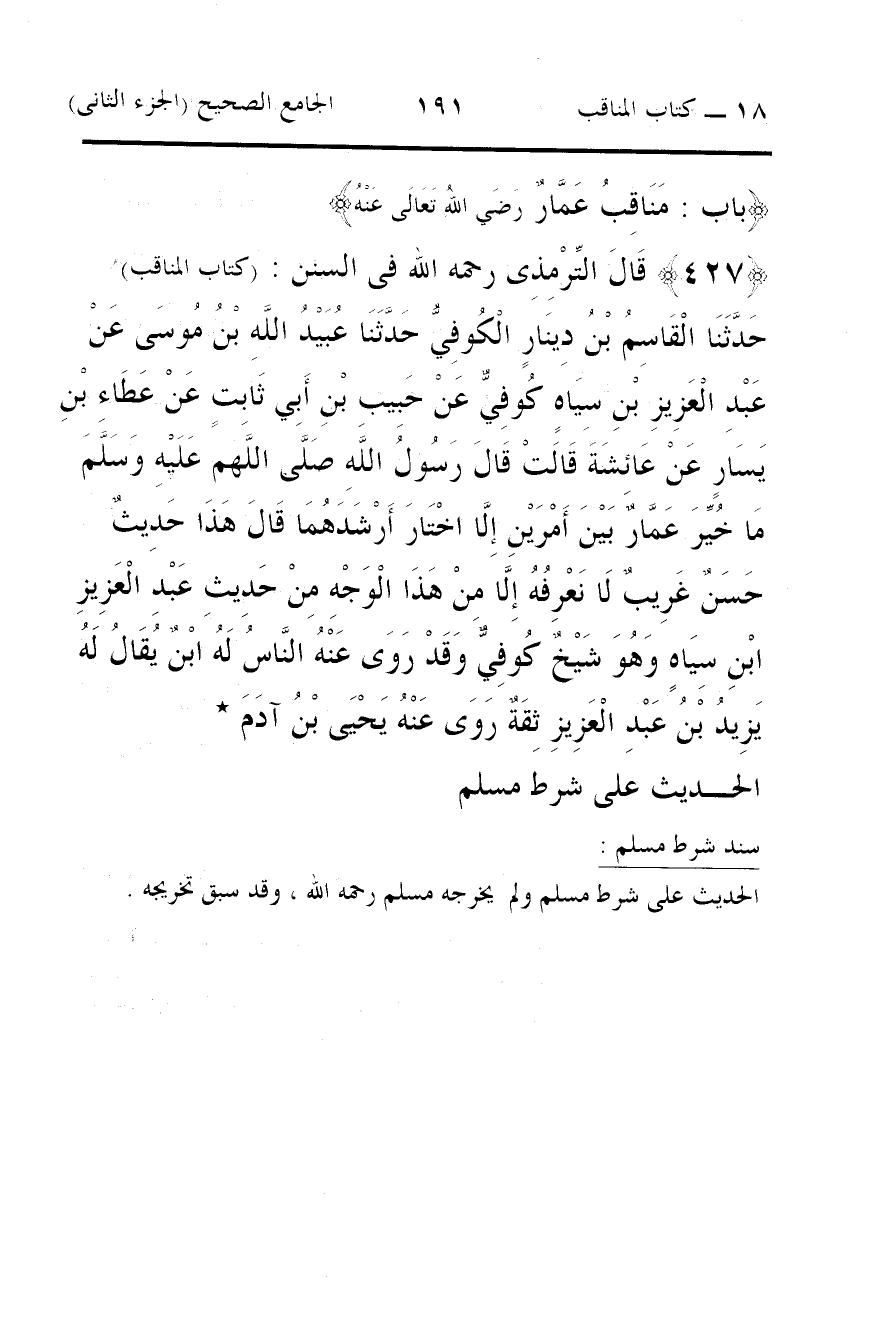 427 - قَالَ التِّرْمِذِى رحمه الله فى السنن: (كتاب المناقب) حَدَّثَنَا الْقَاسِمُ بْنُ دِينَارٍ الْكُوفِيُّ حَدَّثَنَا عُبَيْدُ اللَّهِ بْنُ مُوسَى عَنْ عَبْدِ الْعَزِيزِ بْنِ سِيَاهٍ كُوفِيٌّ عَنْ حَبِيبِ بْنِ أَبِي ثَابِتٍ عَنْ عَطَاءِ بْنِ يَسَارٍ عَنْ عَائِشَةَ قَالَتْ قَالَ رَسُولُ اللَّهِ صَلَّى اللَّهم عَلَيْهِ وَسَلَّمَ مَا خُيِّرَ عَمَّارٌ بَيْنَ أَمْرَيْنِ إِلَّا اخْتَارَ أَرْشَدَهُمَا قَالَ هَذَا حَدِيثٌ حَسَنٌ غَرِيبٌ لَا نَعْرِفُهُ إِلَّا مِنْ هَذَا الْوَجْهِ مِنْ حَدِيثِ عَبْدِ الْعَزِيزِ ابْنِ سِيَاهٍ وَهُوَ شَيْخٌ كُوفِيٌّ وَقَدْ رَوَى عَنْهُ النَّاسُ لَهُ ابْنٌ يُقَالُ لَهُ يَزِيدُ بْنُ عَبْدِ الْعَزِيزِ ثِقَةٌ رَوَى عَنْهُ يَحْيَى بْنُ آدَمَ *