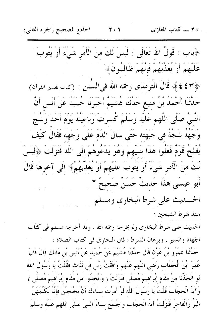 443 - قَالَ التِّرْمِذِى رحمه الله فى السُّنن: (كتاب تفسير القرآن) حَدَّثَنَا أَحْمَدُ بْنُ مَنِيعٍ حَدَّثَنَا هُشَيْمٌ أَخْبَرَنَا حُمَيْدٌ عَنْ أَنَسٍ أَنَّ النَّبِيَّ صَلَّى اللَّهم عَلَيْهِ وَسَلَّمَ كُسِرَتْ رَبَاعِيَتُهُ يَوْمَ أُحُدٍ وَشُجَّ وَجْهُهُ شَجَّةً فِي جَبْهَتِهِ حَتَّى سَالَ الدَّمُ عَلَى وَجْهِهِ فَقَالَ كَيْفَ يُفْلِحُ قَوْمٌ فَعَلُوا هَذَا بِنَبِيِّهِمْ وَهُوَ يَدْعُوهُمْ إِلَى اللَّهِ فَنَزَلَتْ {لَيْسَ لَكَ مِنَ الْأَمْرِ شَيْءٌ أَوْ يَتُوبَ عَلَيْهِمْ أَوْ يُعَذِّبَهُمْ} إِلَى آخِرِهَا قَالَ أَبُو عِيسَى هَذَا حَدِيثٌ حَسَنٌ صَحِيحٌ *