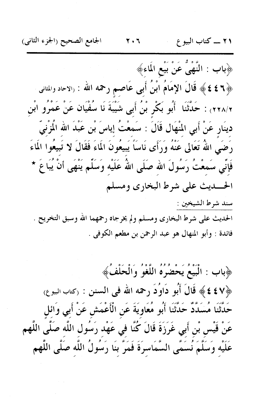 446 - قَالَ الإمَامُ ابْنُ أَبِى عَاصِمٍ رحمه الله: (الاحاد والمثانى 2/ 228): حَدَّثَنَا أَبُو بَكْرٍ بْنُ أَبِى شَيْبَةَ نَا سُفْيَان عَنْ عَمْرُو ابْنِ دِينَارٍ عَنْ أَبي المِنْهَال قَاَلَ: سَمِعْتُ إِياسَ بْن عَبْدَ اللهِ المُزْنِيّ رَضَي اللهُ تَعَالى عَنْهُ وَرَأَى نَاسَاً يَبِيعُونَ المَاءَ فَقَالَ لا تَبِيعُوا المَاءَ فَإِنِّي سَمِعْتُ رَسُولَ اللهِ صَلَى اللهُ عَلَيْهِ وَسَلِّم يَنْهَى أنْ يُبَاعَ *
