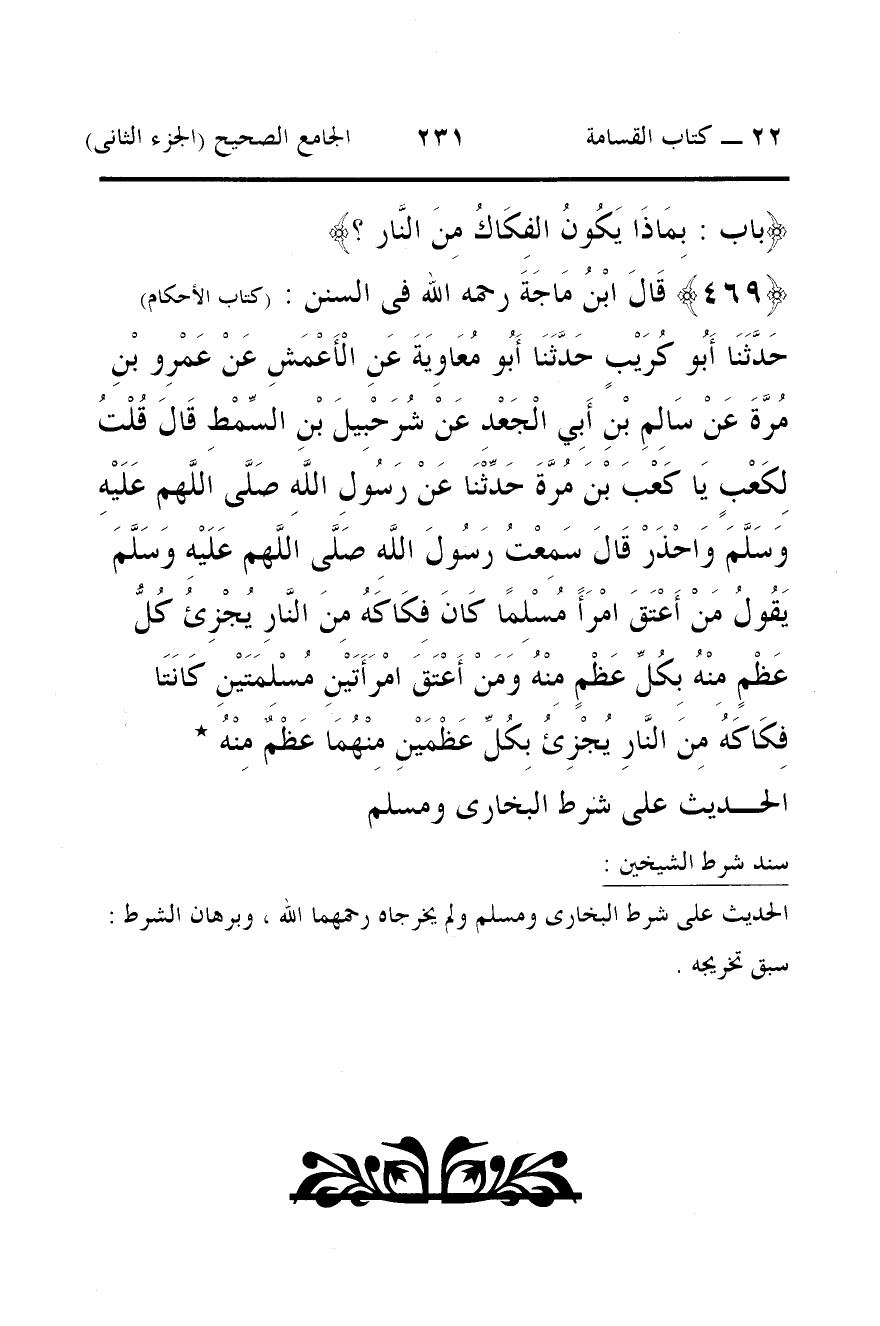 469 - قَالَ ابْنُ مَاجَةَ رحمه الله فى السنن: (كتاب الأحكام) حَدَّثَنَا أَبُو كُرَيْبٍ حَدَّثَنَا أَبُو مُعَاوِيَةَ عَنِ الْأَعْمَشِ عَنْ عَمْرِو بْنِ مُرَّةَ عَنْ سَالِمِ بْنِ أَبِي الْجَعْدِ عَنْ شُرَحْبِيلَ بْنِ السِّمْطِ قَالَ قُلْتُ