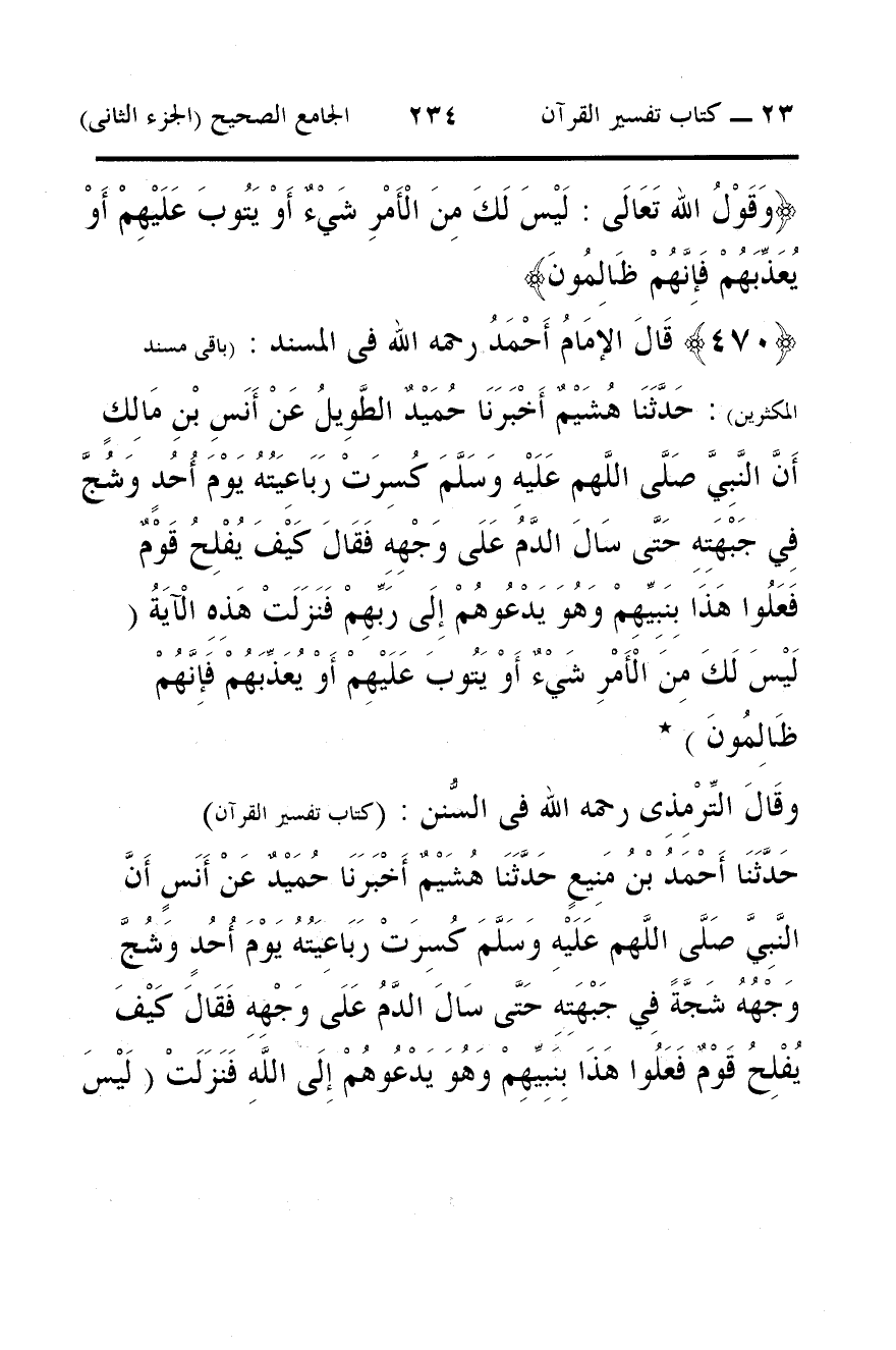 470 - قَالَ الإمَامُ أَحْمَدُ رحمه الله فى المسند: (باقى مسند المكثرين): حَدَّثَنَا هُشَيْمٌ أَخْبَرَنَا حُمَيْدٌ الطَّوِيلُ عَنْ أَنَسِ بْنِ مَالِكٍ أَنَّ النَّبِيَّ صَلَّى اللَّهم عَلَيْهِ وَسَلَّمَ كُسِرَتْ رَبَاعِيَتُهُ يَوْمَ أُحُدٍ وَشُجَّ فِي جَبْهَتِهِ حَتَّى سَالَ الدَّمُ عَلَى وَجْهِهِ فَقَالَ كَيْفَ يُفْلِحُ قَوْمٌ فَعَلُوا هَذَا بِنَبِيِّهِمْ وَهُوَ يَدْعُوهُمْ إِلَى رَبِّهِمْ فَنَزَلَتْ هَذِهِ الْآيَةُ (لَيْسَ لَكَ مِنَ الْأَمْرِ شَيْءٌ أَوْ يَتُوبَ عَلَيْهِمْ أَوْ يُعَذِّبَهُمْ فَإِنَّهُمْ ظَالِمُونَ) *