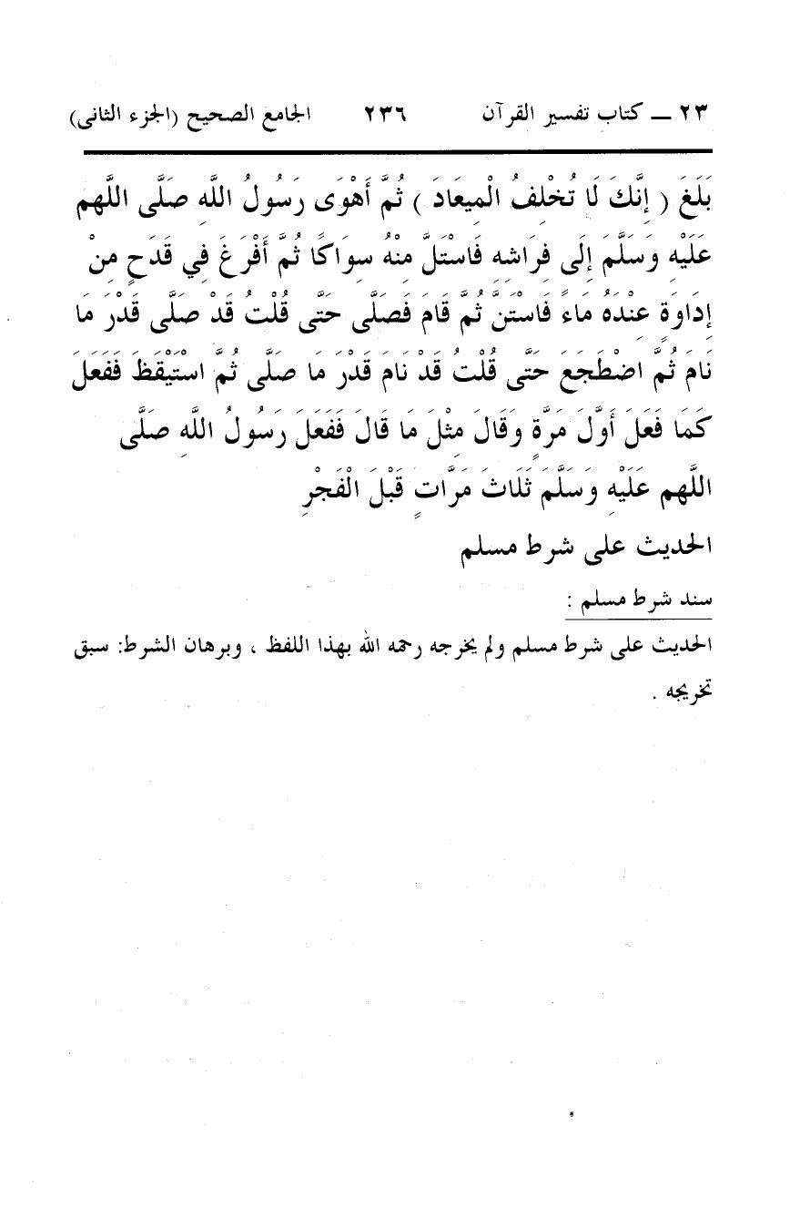 بَلَغَ (إِنَّكَ لَا تُخْلِفُ الْمِيعَادَ) ثُمَّ أَهْوَى رَسُولُ اللَّهِ صَلَّى اللَّهم عَلَيْهِ وَسَلَّمَ إِلَى فِرَاشِهِ فَاسْتَلَّ مِنْهُ سِوَاكًا ثُمَّ أَفْرَغَ فِي قَدَحٍ مِنْ إِدَاوَةٍ عِنْدَهُ مَاءً فَاسْتَنَّ ثُمَّ قَامَ فَصَلَّى حَتَّى قُلْتُ قَدْ صَلَّى قَدْرَ مَا نَامَ ثُمَّ اضْطَجَعَ حَتَّى قُلْتُ قَدْ نَامَ قَدْرَ مَا صَلَّى ثُمَّ اسْتَيْقَظَ فَفَعَلَ كَمَا فَعَلَ أَوَّلَ مَرَّةٍ وَقَالَ مِثْلَ مَا قَالَ فَفَعَلَ رَسُولُ اللَّهِ صَلَّى اللَّهم عَلَيْهِ وَسَلَّمَ ثَلَاثَ مَرَّاتٍ قَبْلَ الْفَجْرِ