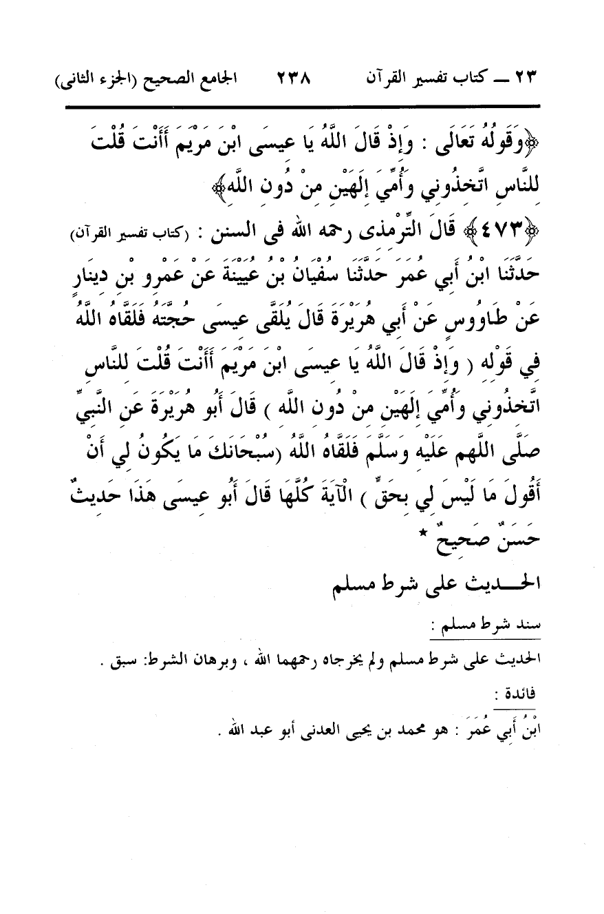473 - قَالَ التِّرْمِذِى رحمه الله فى السنن: (كتاب تفسير القرآن) حَدَّثَنَا ابْنُ أَبِي عُمَرَ حَدَّثَنَا سُفْيَانُ بْنُ عُيَيْنَةَ عَنْ عَمْرِو بْنِ دِينَارٍ عَنْ طَاوُوسٍ عَنْ أَبِي هُرَيْرَةَ قَالَ يُلَقَّى عِيسَى حُجَّتَهُ فَلَقَّاهُ اللَّهُ فِي قَوْلِهِ (وَإِذْ قَالَ اللَّهُ يَا عِيسَى ابْنَ مَرْيَمَ أَأَنْتَ قُلْتَ لِلنَّاسِ اتَّخِذُونِي وَأُمِّيَ إِلَهَيْنِ مِنْ دُونِ اللَّهِ) قَالَ أَبُو هُرَيْرَةَ عَنِ النَّبِيِّ صَلَّى اللَّهم عَلَيْهِ وَسَلَّمَ فَلَقَّاهُ اللَّهُ (سُبْحَانَكَ مَا يَكُونُ لِي أَنْ أَقُولَ مَا لَيْسَ لِي بِحَقٍّ) الْآيَةَ كُلَّهَا قَالَ أَبُو عِيسَى هَذَا حَدِيثٌ حَسَنٌ صَحِيحٌ *