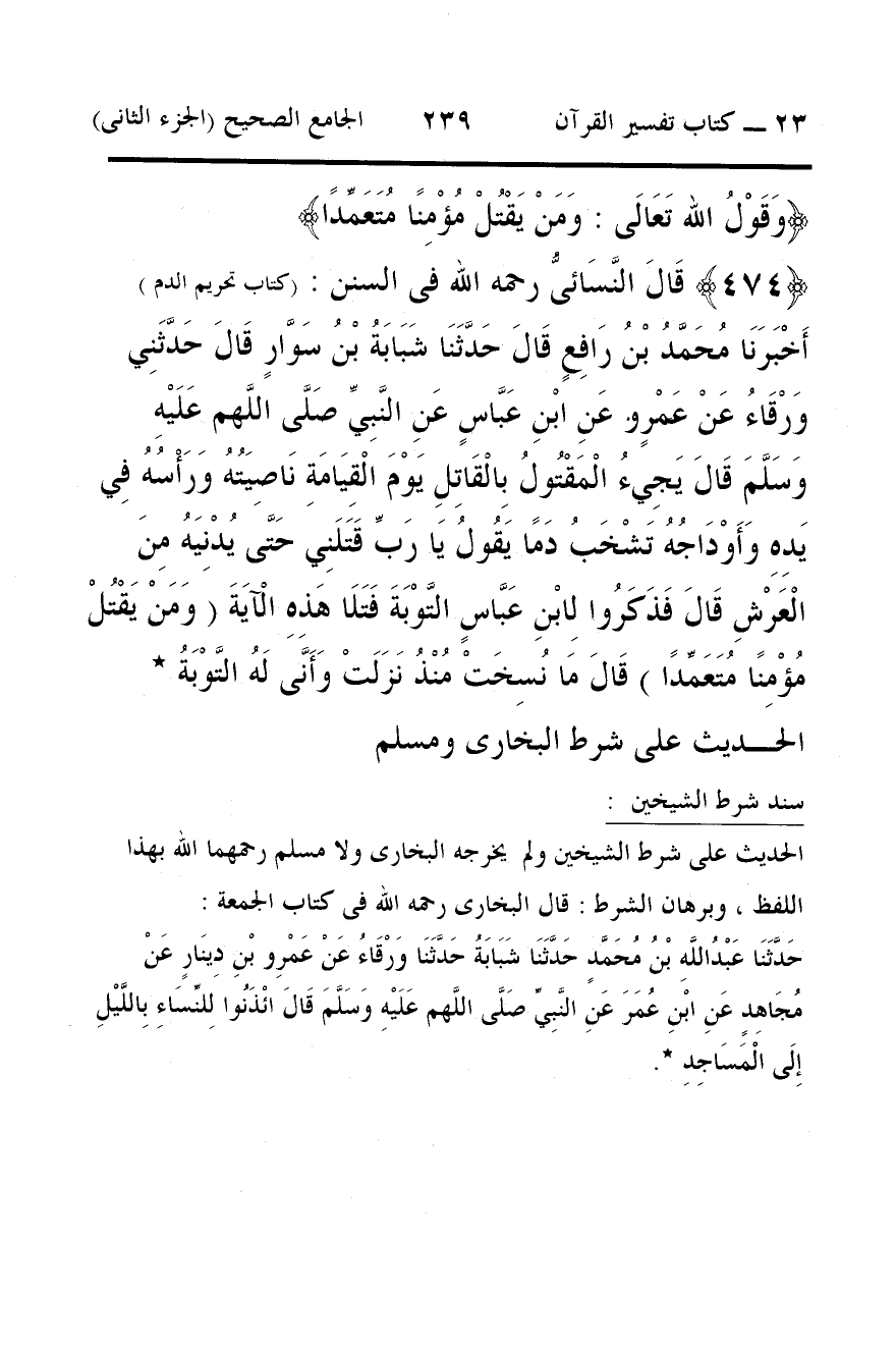474 - قَالَ النَّسَائىُّ رحمه الله فى السنن: (كتاب تحريم الدم) أَخْبَرَنَا مُحَمَّدُ بْنُ رَافِعٍ قَالَ حَدَّثَنَا شَبَابَةُ بْنُ سَوَّارٍ قَالَ حَدَّثَنِي وَرْقَاءُ عَنْ عَمْرٍو عَنِ ابْنِ عَبَّاسٍ عَنِ النَّبِيِّ صَلَّى اللَّهم عَلَيْهِ وَسَلَّمَ قَالَ يَجِيءُ الْمَقْتُولُ بِالْقَاتِلِ يَوْمَ الْقِيَامَةِ نَاصِيَتُهُ وَرَاسُهُ فِي يَدِهِ وَأَوْدَاجُهُ تَشْخَبُ دَمًا يَقُولُ يَا رَبِّ قَتَلَنِي حَتَّى يُدْنِيَهُ مِنَ الْعَرْشِ قَالَ فَذَكَرُوا لِابْنِ عَبَّاسٍ التَّوْبَةَ فَتَلَا هَذِهِ الْآيَةَ (وَمَنْ يَقْتُلْ مُؤْمِنًا مُتَعَمِّدًا) قَالَ مَا نُسِخَتْ مُنْذُ نَزَلَتْ وَأَنَّى لَهُ التَّوْبَةُ *