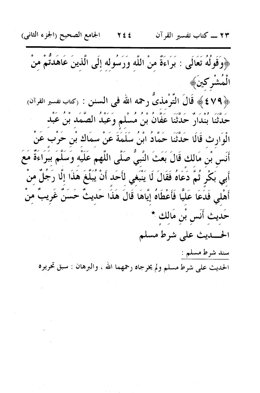 479 - قَالَ التِّرْمِذِىُّ رحمه الله فى السنن: (كتاب تفسير القرآن) حَدَّثَنَا بُنْدَارٌ حَدَّثَنَا عَفَّانُ بْنُ مُسْلِمٍ وَعَبْدُ الصَّمَدِ بْنُ عَبْدِ الْوَارِثِ قَالَا حَدَّثَنَا حَمَّادُ ابْنُ سَلَمَةَ عَنْ سِمَاكِ بْنِ حَرْبٍ عَنْ أَنَسِ بْنِ مَالِكٍ قَالَ بَعَثَ النَّبِيُّ صَلَّى اللَّهم عَلَيْهِ وَسَلَّمَ بِبَرَاءَةٌ مَعَ أَبِي بَكْرٍ ثُمَّ دَعَاهُ فَقَالَ لَا يَنْبَغِي لِأَحَدٍ أَنْ يُبَلِّغَ هَذَا إِلَّا رَجُلٌ مِنْ أَهْلِي فَدَعَا عَلِيًّا فَأَعْطَاهُ إِيَّاهَا قَالَ هَذَا حَدِيثٌ حَسَنٌ غَرِيبٌ مِنْ حَدِيثِ أَنَسِ بْنِ مَالِكٍ *
