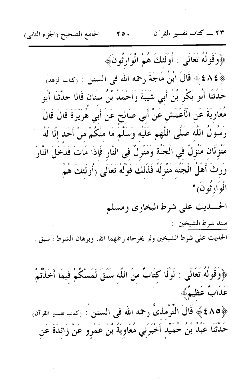 485 - قَالَ التِّرْمِذِىُّ رحمه الله فى السنن: (كتاب تفسير القرآن) حَدَّثَنَا عَبْدُ بْنُ حُمَيْدٍ أَخْبَرَنِي مُعَاوِيَةُ بْنُ عَمْرٍو عَنْ زَائِدَةَ عَنِ