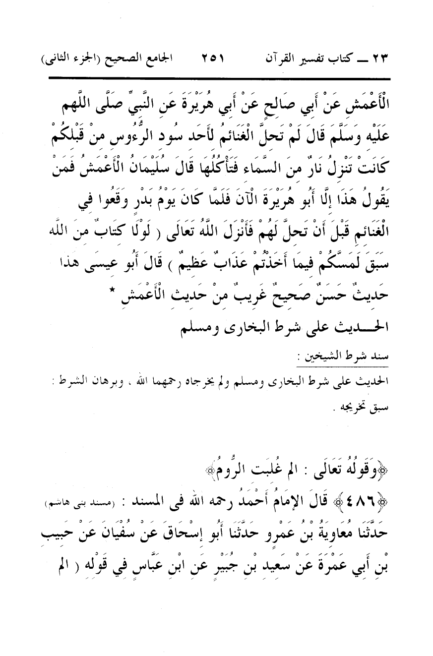486 - قَالَ الإمَامُ أَحْمَدُ رحمه الله فى المسند: (مسند بنى هاشم) حَدَّثَنَا مُعَاوِيَةُ بْنُ عَمْرٍو حَدَّثَنَا أَبُو إِسْحَاقَ عَنْ سُفْيَانَ عَنْ حَبِيبِ بْنِ أَبِي عَمْرَةَ عَنْ سَعِيدِ بْنِ جُبَيْرٍ عَنِ ابْنِ عَبَّاسٍ فِي قَوْلِهِ (الم