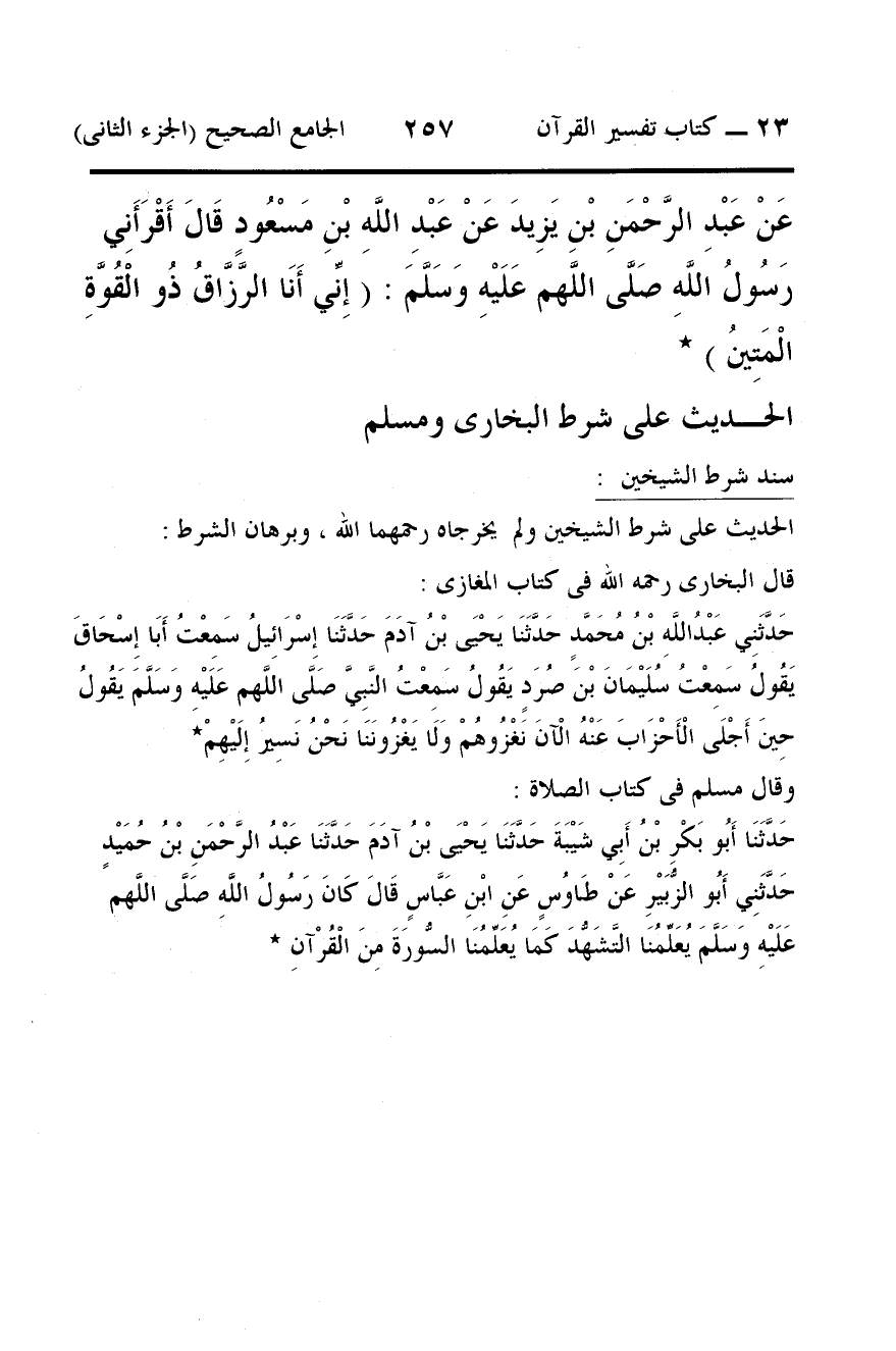 عَنْ عَبْدِ الرَّحْمَنِ بْنِ يَزِيدَ عَنْ عَبْدِ اللَّهِ بْنِ مَسْعُودٍ قَالَ أَقْرَأَنِي رَسُولُ اللَّهِ صَلَّى اللَّهم عَلَيْهِ وَسَلَّمَ: (إِنِّي أَنَا الرَّزَّاقُ ذُو الْقُوَّةِ الْمَتِينُ) *