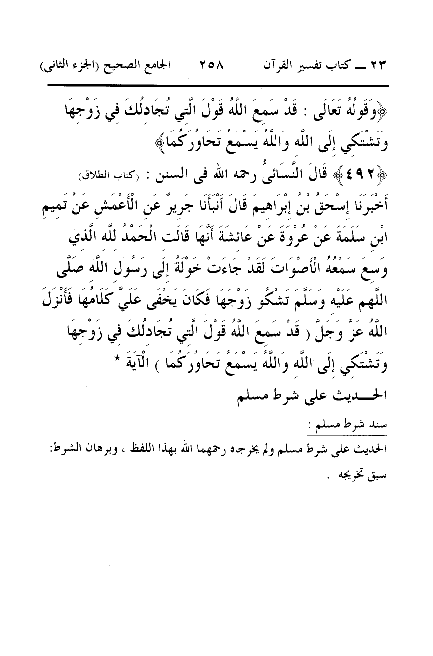 أَخْبَرَنَا إِسْحَقُ بْنُ إِبْرَاهِيمَ قَالَ أَنْبَأَنَا جَرِيرٌ عَنِ الْأَعْمَشِ عَنْ تَمِيمِ ابْنِ سَلَمَةَ عَنْ عُرْوَةَ عَنْ عَائِشَةَ أَنَّهَا قَالَتِ الْحَمْدُ لِلَّهِ الَّذِي وَسِعَ سَمْعُهُ الْأَصْوَاتَ لَقَدْ جَاءَتْ خَوْلَةُ إِلَى رَسُولِ اللَّهِ صَلَّى اللَّهم عَلَيْهِ وَسَلَّمَ تَشْكُو زَوْجَهَا فَكَانَ يَخْفَى عَلَيَّ كَلَامُهَا فَأَنْزَلَ اللَّهُ عَزَّ وَجَلَّ (قَدْ سَمِعَ اللَّهُ قَوْلَ الَّتِي تُجَادِلُكَ فِي زَوْجِهَا وَتَشْتَكِي إِلَى اللَّهِ وَاللَّهُ يَسْمَعُ تَحَاوُرَكُمَا) الْآيَةَ *