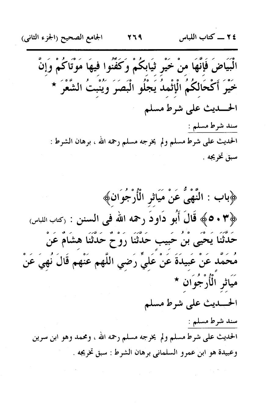 503 - قَالَ أَبُو دَاودَ رحمه الله فى السنن: (كتاب اللباس) حَدَّثَنَا يَحْيَى بْنُ حَبِيبٍ حَدَّثَنَا رَوْحٌ حَدَّثَنَا هِشَامٌ عَنْ مُحَمَّدٍ عَنْ عَبِيدَةَ عَنْ عَلِيٍّ رَضِي اللَّهم عَنْهم قَالَ نُهِيَ عَنْ مَيَاثِرِ الْأُرْجُوَانِ *