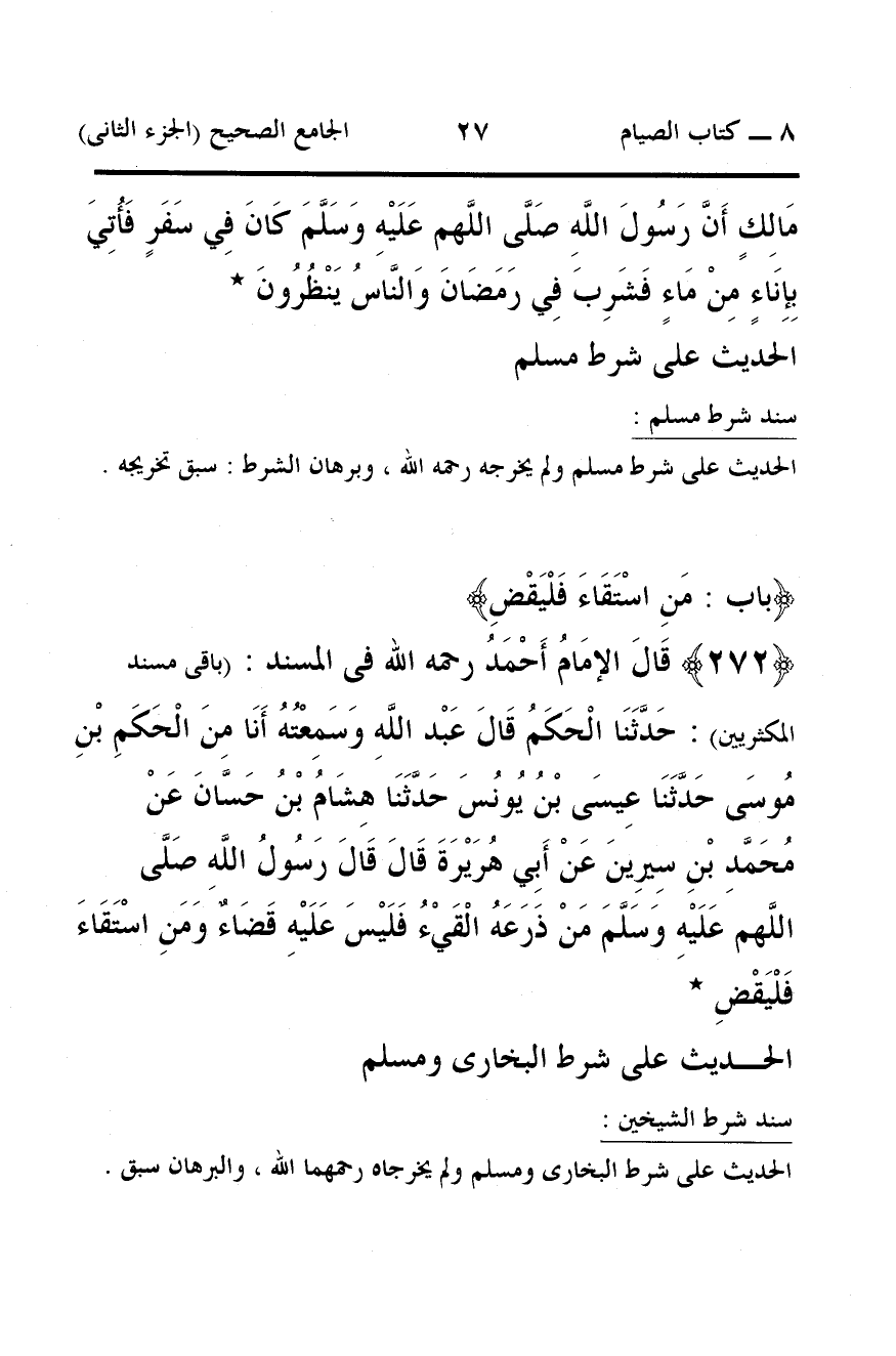 272 - قَالَ الإمَامُ أَحْمَدُ رحمه الله فى المسند: (باقى مسند المكثريين): حَدَّثَنَا الْحَكَمُ قَالَ عَبْد اللَّهِ وَسَمِعْتُهُ أَنَا مِنَ الْحَكَمِ بْنِ مُوسَى حَدَّثَنَا عِيسَى بْنُ يُونُسَ حَدَّثَنَا هِشَامُ بْنُ حَسَّانَ عَنْ مُحَمَّدِ بْنِ سِيرِينَ عَنْ أَبِي هُرَيْرَةَ قَالَ قَالَ رَسُولُ اللَّهِ صَلَّى اللَّهم عَلَيْهِ وَسَلَّمَ مَنْ ذَرَعَهُ الْقَيْءُ فَلَيْسَ عَلَيْهِ قَضَاءٌ وَمَنِ اسْتَقَاءَ فَلْيَقْضِ *