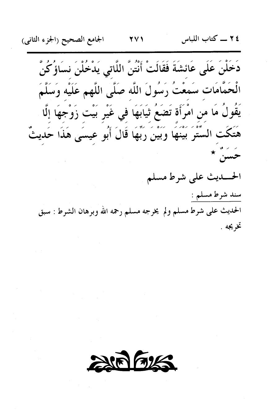 دَخَلْنَ عَلَى عَائِشَةَ فَقَالَتْ أَنْتُنَّ اللَّاتِي يَدْخُلْنَ نِسَاؤُكُنَّ الْحَمَّامَاتِ سَمِعْتُ رَسُولَ اللَّهِ صَلَّى اللَّهم عَلَيْهِ وَسَلَّمَ يَقُولُ مَا مِنِ امْرَأَةٍ تَضَعُ ثِيَابَهَا فِي غَيْرِ بَيْتِ زَوْجِهَا إِلَّا هَتَكَتِ السِّتْرَ بَيْنَهَا وَبَيْنَ رَبِّهَا قَالَ أَبُو عِيسَى هَذَا حَدِيثٌ حَسَنٌ *