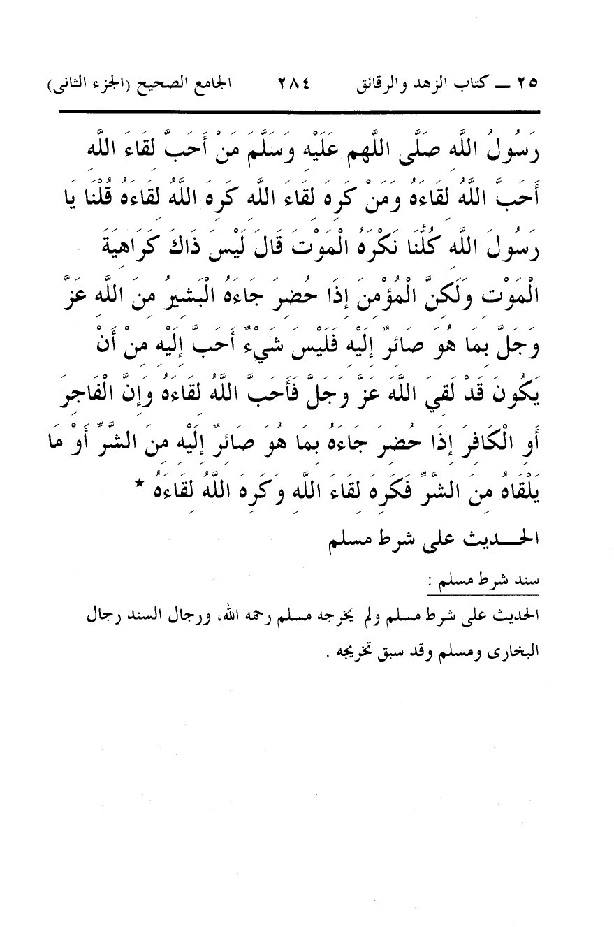 رَسُولُ اللَّهِ صَلَّى اللَّهم عَلَيْهِ وَسَلَّمَ مَنْ أَحَبَّ لِقَاءَ اللَّهِ أَحَبَّ اللَّهُ لِقَاءَهُ وَمَنْ كَرِهَ لِقَاءَ اللَّهِ كَرِهَ اللَّهُ لِقَاءَهُ قُلْنَا يَا رَسُولَ اللَّهِ كُلُّنَا نَكْرَهُ الْمَوْتَ قَالَ لَيْسَ ذَاكَ كَرَاهِيَةَ الْمَوْتِ وَلَكِنَّ الْمُؤْمِنَ إِذَا حُضِرَ جَاءَهُ الْبَشِيرُ مِنَ اللَّهِ عَزَّ وَجَلَّ بِمَا هُوَ صَائِرٌ إِلَيْهِ فَلَيْسَ شَيْءٌ أَحَبَّ إِلَيْهِ مِنْ أَنْ يَكُونَ قَدْ لَقِيَ اللَّهَ عَزَّ وَجَلَّ فَأَحَبَّ اللَّهُ لِقَاءَهُ وَإِنَّ الْفَاجِرَ أَوِ الْكَافِرَ إِذَا حُضِرَ جَاءَهُ بِمَا هُوَ صَائِرٌ إِلَيْهِ مِنَ الشَّرِّ أَوْ مَا يَلْقَاهُ مِنَ الشَّرِّ فَكَرِهَ لِقَاءَ اللَّهِ وَكَرِهَ اللَّهُ لِقَاءَهُ *