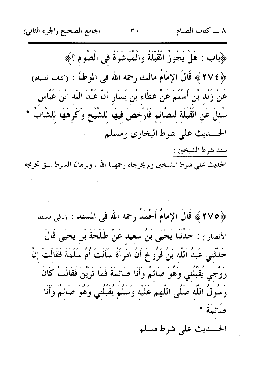275 - قَالَ الإمَامُ أَحْمَدُ رحمه الله فى المسند: (باقى مسند الأنصار): حَدَّثَنَا يَحْيَى بْنُ سَعِيدٍ عَنْ طَلْحَةَ بْنِ يَحْيَى قَالَ حَدَّثَنِي عَبْدُ اللَّهِ بْنُ فَرُّوخَ أَنَّ امْرَأَةً سَأَلَتْ أُمَّ سَلَمَةَ فَقَالَتْ إِنَّ زَوْجِي يُقَبِّلُنِي وَهُوَ صَائِمٌ وَأَنَا صَائِمَةٌ فَمَا تَرَيْنَ فَقَالَتْ كَانَ رَسُولُ اللَّهِ صَلَّى اللَّهم عَلَيْهِ وَسَلَّمَ يُقَبِّلُنِي وَهُوَ صَائِمٌ وَأَنَا صَائِمَةٌ *
