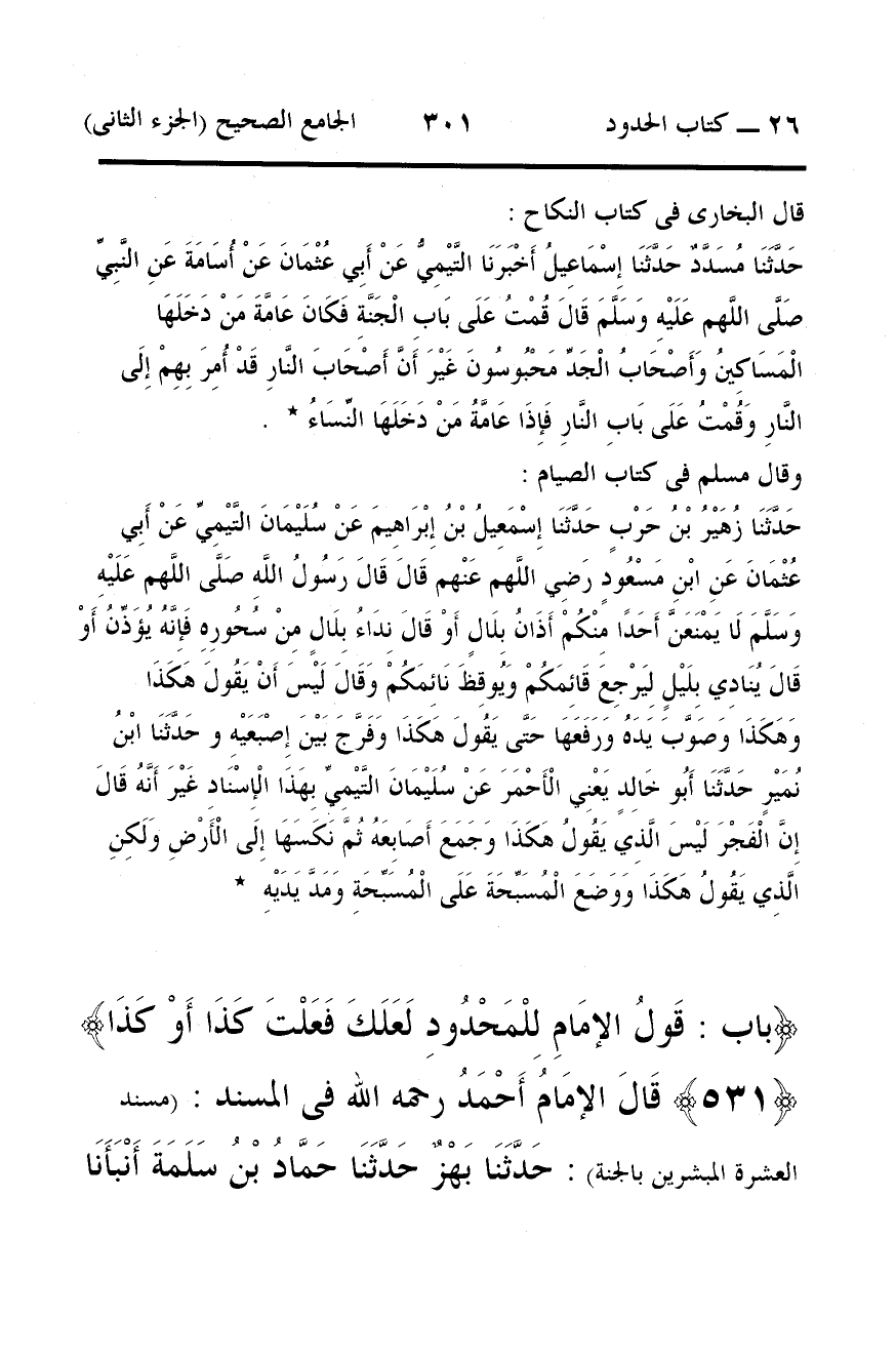 حَدَّثَنَا مُسَدَّدٌ حَدَّثَنَا إِسْمَاعِيلُ أَخْبَرَنَا التَّيْمِيُّ عَنْ أَبِي عُثْمَانَ عَنْ أُسَامَةَ عَنِ النَّبِيِّ صَلَّى اللَّهم عَلَيْهِ وَسَلَّمَ قَالَ قُمْتُ عَلَى بَابِ الْجَنَّةِ فَكَانَ عَامَّةَ مَنْ دَخَلَهَا الْمَسَاكِينُ وَأَصْحَابُ الْجَدِّ مَحْبُوسُونَ غَيْرَ أَنَّ أَصْحَابَ النَّارِ قَدْ أُمِرَ بِهِمْ إِلَى النَّارِ وَقُمْتُ عَلَى بَابِ النَّارِ فَإِذَا عَامَّةُ مَنْ دَخَلَهَا النِّسَاءُ *.