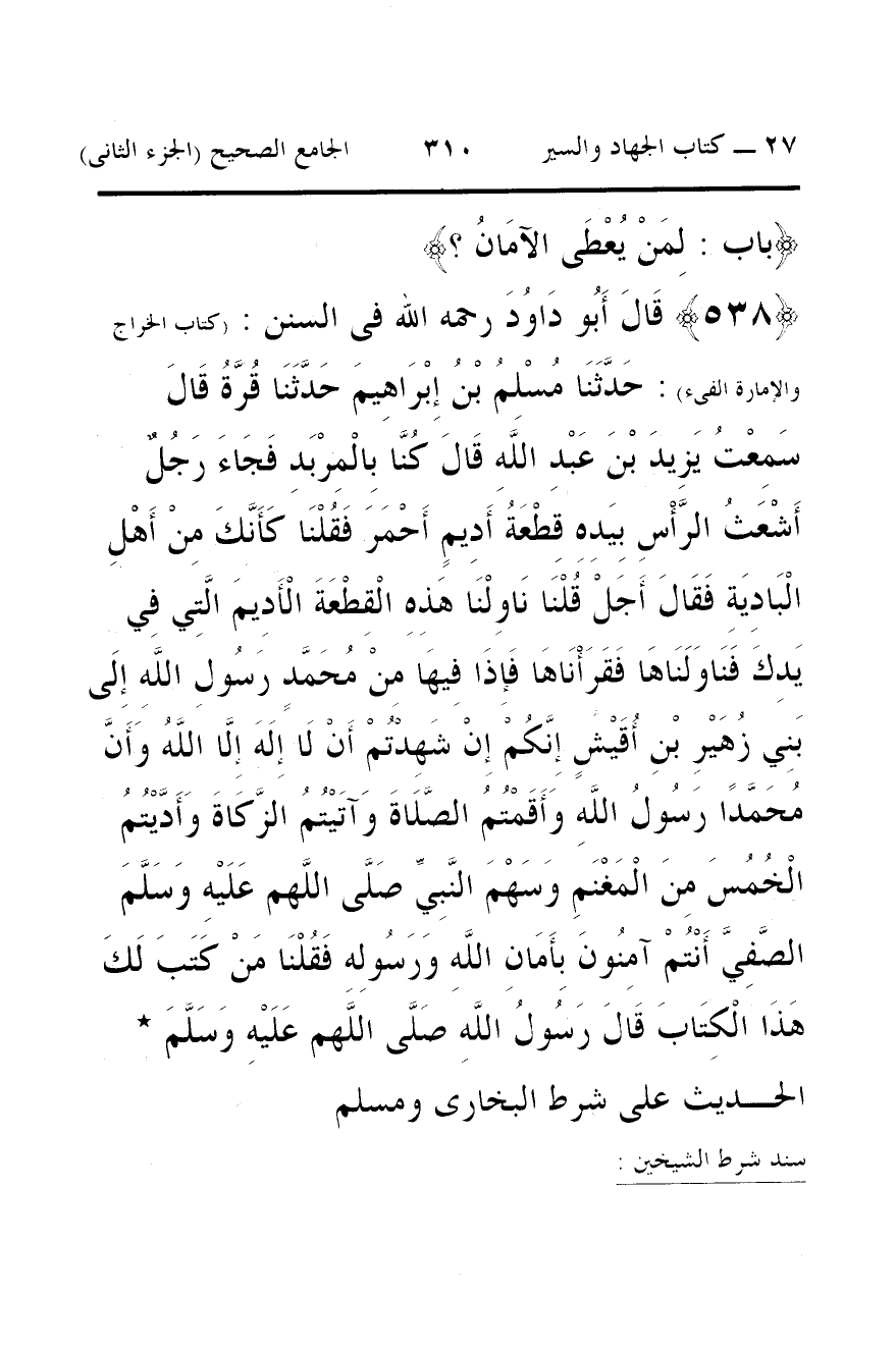 538 - قَالَ أَبُو دَاوُدَ رحمه الله فى السنن: (كتاب الخراج والإمارة الفىء): حَدَّثَنَا مُسْلِمُ بْنُ إِبْرَاهِيمَ حَدَّثَنَا قُرَّةُ قَالَ سَمِعْتُ يَزِيدَ بْنَ عَبْدِ اللَّهِ قَالَ كُنَّا بِالْمِرْبَدِ فَجَاءَ رَجُلٌ أَشْعَثُ الرَّاسِ بِيَدِهِ قِطْعَةُ أَدِيمٍ أَحْمَرَ فَقُلْنَا كَأَنَّكَ مِنْ أَهْلِ الْبَادِيَةِ فَقَالَ أَجَلْ قُلْنَا نَاوِلْنَا هَذِهِ الْقِطْعَةَ الْأَدِيمَ الَّتِي فِي يَدِكَ فَنَاوَلَنَاهَا فَقَرَانَاهَا فَإِذَا فِيهَا مِنْ مُحَمَّدٍ رَسُولِ اللَّهِ إِلَى بَنِي زُهَيْرِ بْنِ أُقَيْشٍ إِنَّكُمْ إِنْ شَهِدْتُمْ أَنْ لَا إِلَهَ إِلَّا اللَّهُ وَأَنَّ مُحَمَّدًا رَسُولُ اللَّهِ وَأَقَمْتُمُ الصَّلَاةَ وَآتَيْتُمُ الزَّكَاةَ وَأَدَّيْتُمُ الْخُمُسَ مِنَ الْمَغْنَمِ وَسَهْمَ النَّبِيِّ صَلَّى اللَّهم عَلَيْهِ وَسَلَّمَ الصَّفِيَّ أَنْتُمْ آمِنُونَ بِأَمَانِ اللَّهِ وَرَسُولِهِ فَقُلْنَا مَنْ كَتَبَ لَكَ هَذَا الْكِتَابَ قَالَ رَسُولُ اللَّهِ صَلَّى اللَّهم عَلَيْهِ وَسَلَّمَ *