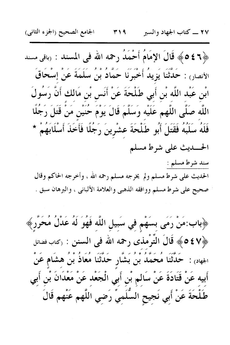 547 - قَالَ التِّرْمِذِى رحمه الله فى السنن: (كتاب فضائل الجهاد): حَدَّثَنَا مُحَمَّدُ بْنُ بَشَّارٍ حَدَّثَنَا مُعَاذُ بْنُ هِشَامٍ عَنْ أَبِيهِ عَنْ قَتَادَةَ عَنْ سَالِمِ بْنِ أَبِي الْجَعْدِ عَنْ مَعْدَانَ بْنِ أَبِي طَلْحَةَ عَنْ أَبِي نَجِيحٍ السُّلَمِيِّ رَضِي اللَّهم عَنْهم قَالَ