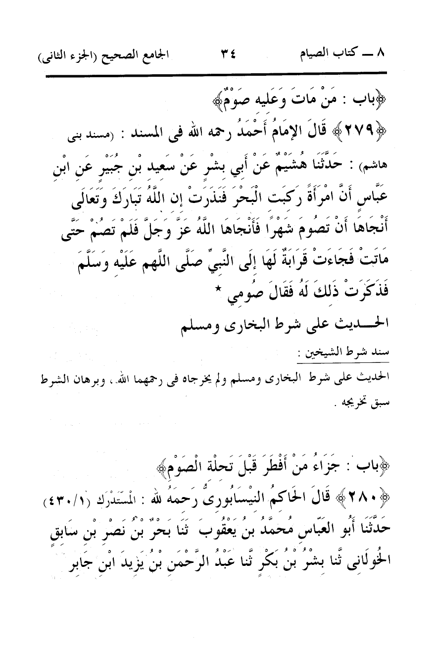 279 - قَالَ الإمَامُ أَحْمَدُ رحمه الله فى المسند: (مسند بنى هاشم): حَدَّثَنَا هُشَيْمٌ عَنْ أَبِي بِشْرٍ عَنْ سَعِيدِ بْنِ جُبَيْرٍ عَنِ ابْنِ عَبَّاسٍ أَنَّ امْرَأَةً رَكِبَتِ الْبَحْرَ فَنَذَرَتْ إِنِ اللَّهُ تَبَارَكَ وَتَعَالَى أَنْجَاهَا أَنْ تَصُومَ شَهْرًا فَأَنْجَاهَا اللَّهُ عَزَّ وَجَلَّ فَلَمْ تَصُمْ حَتَّى مَاتَتْ فَجَاءَتْ قَرَابَةٌ لَهَا إِلَى النَّبِيِّ صَلَّى اللَّهم عَلَيْهِ وَسَلَّمَ فَذَكَرَتْ ذَلِكَ لَهُ فَقَالَ صُومِي *