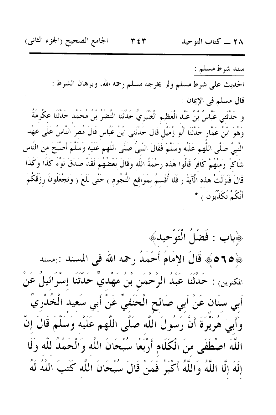 565 - قَالَ الإمَامُ أَحْمَدُ رحمه الله فى المسند: (مسند المكثرين): حَدَّثَنَا عَبْدُ الرَّحْمَنِ بْنُ مَهْدِيٍّ حَدَّثَنَا إِسْرَائِيلُ عَنْ أَبِي سِنَانٍ عَنْ أَبِي صَالِحٍ الْحَنَفِيِّ عَنْ أَبِي سَعِيدٍ الْخُدْرِيِّ وَأَبِي هُرَيْرَةَ أَنَّ رَسُولَ اللَّهِ صَلَّى اللَّهم عَلَيْهِ وَسَلَّمَ قَالَ إِنَّ اللَّهَ اصْطَفَى مِنَ الْكَلَامِ أَرْبَعًا سُبْحَانَ اللَّهِ وَالْحَمْدُ لِلَّهِ وَلَا إِلَهَ إِلَّا اللَّهُ وَاللَّهُ أَكْبَرُ فَمَنْ قَالَ سُبْحَانَ اللَّهِ كَتَبَ اللَّهُ لَهُ