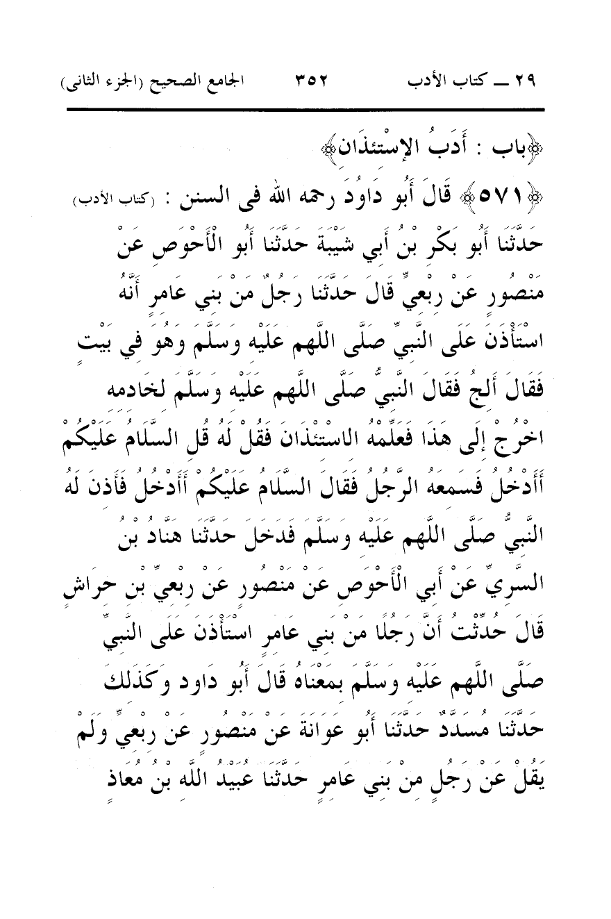 571 - قَالَ أَبُو دَاوُدَ رحمه الله فى السنن: (كتاب الأدب) حَدَّثَنَا أَبُو بَكْرِ بْنُ أَبِي شَيْبَةَ حَدَّثَنَا أَبُو الْأَحْوَصِ عَنْ مَنْصُورٍ عَنْ رِبْعِيٍّ قَالَ حَدَّثَنَا رَجُلٌ مَنْ بَنِي عَامِرٍ أَنَّهُ اسْتَاذَنَ عَلَى النَّبِيِّ صَلَّى اللَّهم عَلَيْهِ وَسَلَّمَ وَهُوَ فِي بَيْتٍ فَقَالَ أَلِجُ فَقَالَ النَّبِيُّ صَلَّى اللَّهم عَلَيْهِ وَسَلَّمَ لِخَادِمِهِ اخْرُجْ إِلَى هَذَا فَعَلِّمْهُ الِاسْتِئْذَانَ فَقُلْ لَهُ قُلِ السَّلَامُ عَلَيْكُمْ أَأَدْخُلُ فَسَمِعَهُ الرَّجُلُ فَقَالَ السَّلَامُ عَلَيْكُمْ أَأَدْخُلُ فَأَذِنَ لَهُ النَّبِيُّ صَلَّى اللَّهم عَلَيْهِ وَسَلَّمَ فَدَخَلَ حَدَّثَنَا هَنَّادُ بْنُ السَّرِيِّ عَنْ أَبِي الْأَحْوَصِ عَنْ مَنْصُورٍ عَنْ رِبْعِيِّ بْنِ حِرَاشٍ قَالَ حُدِّثْتُ أَنَّ رَجُلًا مَنْ بَنِي عَامِرٍ اسْتَاذَنَ عَلَى النَّبِيِّ صَلَّى اللَّهم عَلَيْهِ وَسَلَّمَ بِمَعْنَاهُ قَالَ أَبُو دَاود وَكَذَلِكَ حَدَّثَنَا مُسَدَّدٌ حَدَّثَنَا أَبُو عَوَانَةَ عَنْ مَنْصُورٍ عَنْ رِبْعِيٍّ وَلَمْ يَقُلْ عَنْ رَجُلٍ مِنْ بَنِي عَامِرٍ حَدَّثَنَا عُبَيْدُ اللَّهِ بْنُ مُعَاذٍ