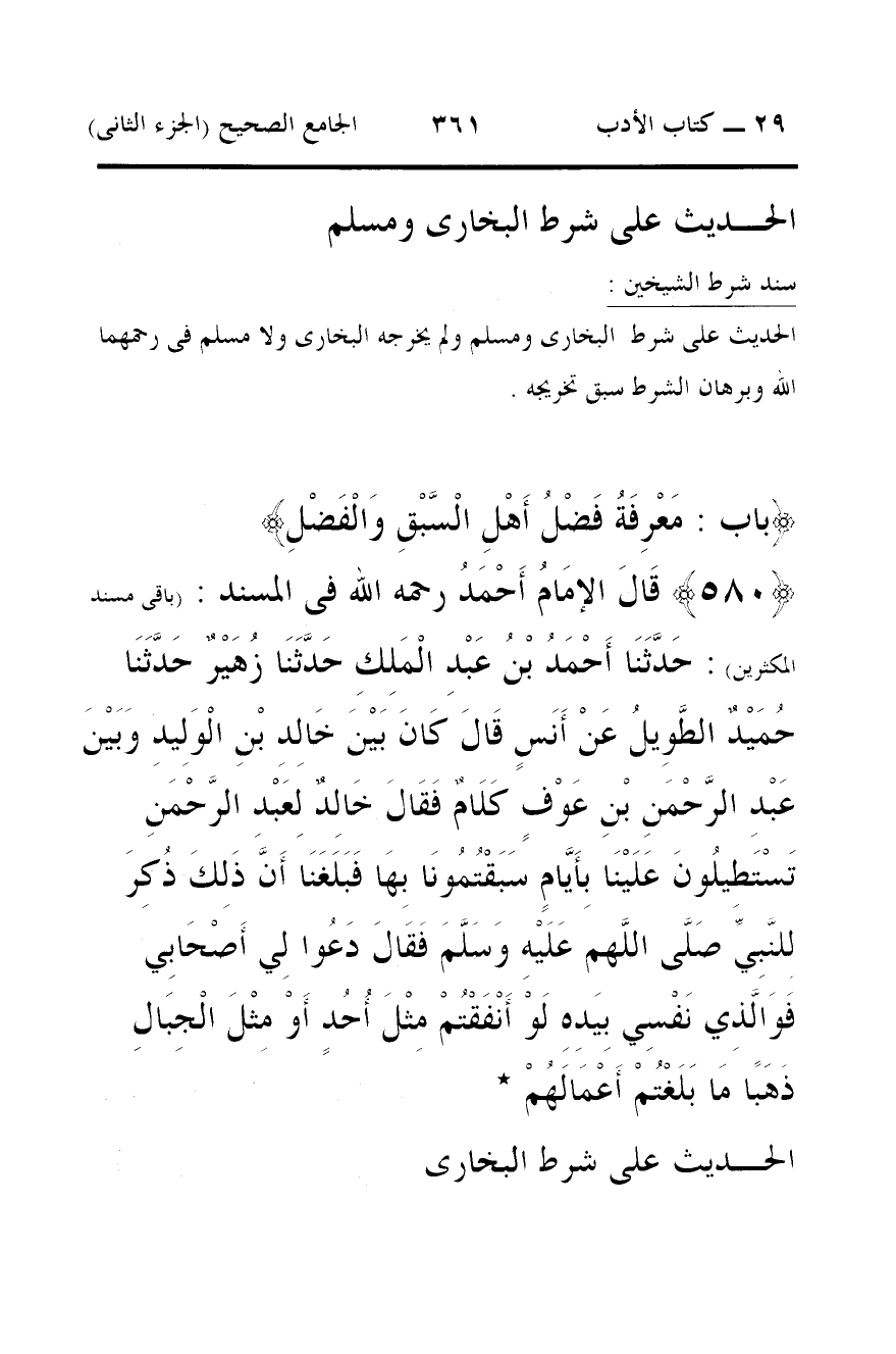 580 - قَالَ الإمَامُ أَحْمَدُ رحمه الله فى المسند: (باقى مسند المكثرين): حَدَّثَنَا أَحْمَدُ بْنُ عَبْدِ الْمَلِكِ حَدَّثَنَا زُهَيْرٌ حَدَّثَنَا حُمَيْدٌ الطَّوِيلُ عَنْ أَنَسٍ قَالَ كَانَ بَيْنَ خَالِدِ بْنِ الْوَلِيدِ وَبَيْنَ عَبْدِ الرَّحْمَنِ بْنِ عَوْفٍ كَلَامٌ فَقَالَ خَالِدٌ لِعَبْدِ الرَّحْمَنِ تَسْتَطِيلُونَ عَلَيْنَا بِأَيَّامٍ سَبَقْتُمُونَا بِهَا فَبَلَغَنَا أَنَّ ذَلِكَ ذُكِرَ لِلنَّبِيِّ صَلَّى اللَّهم عَلَيْهِ وَسَلَّمَ فَقَالَ دَعُوا لِي أَصْحَابِي فَوَالَّذِي نَفْسِي بِيَدِهِ لَوْ أَنْفَقْتُمْ مِثْلَ أُحُدٍ أَوْ مِثْلَ الْجِبَالِ ذَهَبًا مَا بَلَغْتُمْ أَعْمَالَهُمْ *