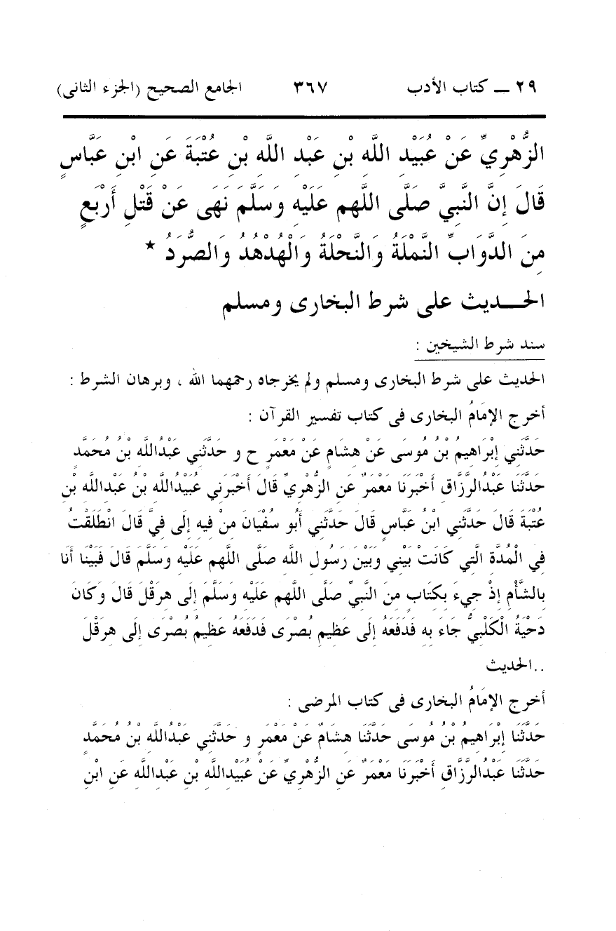 الزُّهْرِيِّ عَنْ عُبَيْدِ اللَّهِ بْنِ عَبْدِ اللَّهِ بْنِ عُتْبَةَ عَنِ ابْنِ عَبَّاسٍ قَالَ إِنَّ النَّبِيَّ صَلَّى اللَّهم عَلَيْهِ وَسَلَّمَ نَهَى عَنْ قَتْلِ أَرْبَعٍ مِنَ الدَّوَابِّ النَّمْلَةُ وَالنَّحْلَةُ وَالْهُدْهُدُ وَالصُّرَدُ *