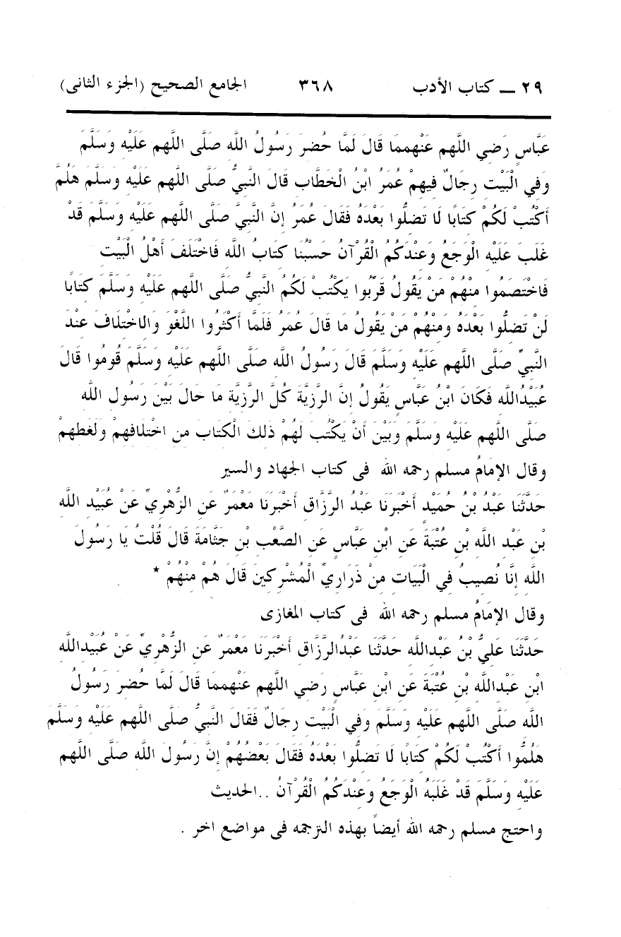 عَبَّاسٍ رَضِي اللَّهم عَنْهممَا قَالَ لَمَّا حُضِرَ رَسُولُ اللَّهِ صَلَّى اللَّهم عَلَيْهِ وَسَلَّمَ وَفِي الْبَيْتِ رِجَالٌ فِيهِمْ عُمَرُ ابْنُ الْخَطَّابِ قَالَ النَّبِيُّ صَلَّى اللَّهم عَلَيْهِ وَسَلَّمَ هَلُمَّ أَكْتُبْ لَكُمْ كِتَابًا لَا تَضِلُّوا بَعْدَهُ فَقَالَ عُمَرُ إِنَّ النَّبِيَّ صَلَّى اللَّهم عَلَيْهِ وَسَلَّمَ قَدْ غَلَبَ عَلَيْهِ الْوَجَعُ وَعِنْدَكُمُ الْقُرْآنُ حَسْبُنَا كِتَابُ اللَّهِ فَاخْتَلَفَ أَهْلُ الْبَيْتِ فَاخْتَصَمُوا مِنْهُمْ مَنْ يَقُولُ قَرِّبُوا يَكْتُبْ لَكُمُ النَّبِيُّ صَلَّى اللَّهم عَلَيْهِ وَسَلَّمَ كِتَابًا لَنْ تَضِلُّوا بَعْدَهُ وَمِنْهُمْ مَنْ يَقُولُ مَا قَالَ عُمَرُ فَلَمَّا أَكْثَرُوا اللَّغْوَ وَالِاخْتِلَافَ عِنْدَ النَّبِيِّ صَلَّى اللَّهم عَلَيْهِ وَسَلَّمَ قَالَ رَسُولُ اللَّهِ صَلَّى اللَّهم عَلَيْهِ وَسَلَّمَ قُومُوا قَالَ عُبَيْدُاللَّهِ فَكَانَ ابْنُ عَبَّاسٍ يَقُولُ إِنَّ الرَّزِيَّةَ كُلَّ الرَّزِيَّةِ مَا حَالَ بَيْنَ رَسُولِ اللَّهِ صَلَّى اللَّهم عَلَيْهِ وَسَلَّمَ وَبَيْنَ أَنْ يَكْتُبَ لَهُمْ ذَلِكَ الْكِتَابَ مِنِ اخْتِلَافِهِمْ وَلَغَطِهِمْ
