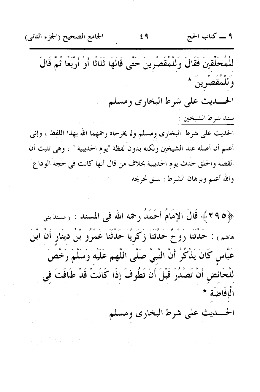 295 - قَالَ الإمَامُ أحْمَدُ رحمه الله فى المسند: (مسند بنى هاشم): حَدَّثَنَا رَوْحٌ حَدَّثَنَا زَكَرِيَّا حَدَّثَنَا عَمْرُو بْنُ دِينَارٍ أَنَّ ابْنَ عَبَّاسٍ كَانَ يَذْكُرُ أَنَّ النَّبِيَّ صَلَّى اللَّهم عَلَيْهِ وَسَلَّمَ رَخَّصَ لِلْحَائِضِ أَنْ تَصْدُرَ قَبْلَ أَنْ تَطُوفَ إِذَا كَانَتْ قَدْ طَافَتْ فِي الْإِفَاضَةِ *