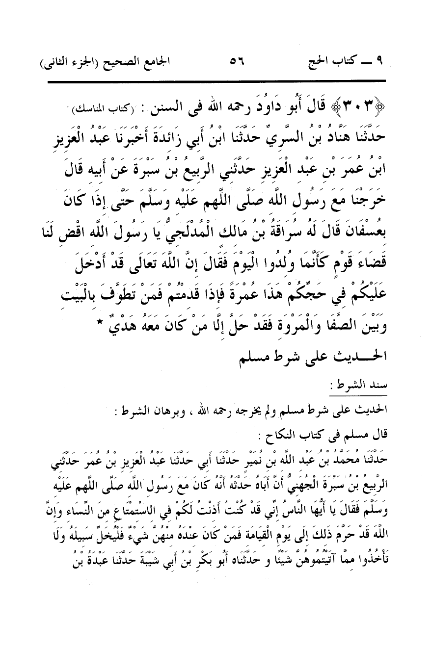 303 - قَالَ أَبُو دَاوُدَ رحمه الله فى السنن: (كتاب المناسك) حَدَّثَنَا هَنَّادُ بْنُ السَّرِيِّ حَدَّثَنَا ابْنُ أَبِي زَائِدَةَ أَخْبَرَنَا عَبْدُ الْعَزِيزِ ابْنُ عُمَرَ بْنِ عَبْدِ الْعَزِيزِ حَدَّثَنِي الرَّبِيعُ بْنُ سَبْرَةَ عَنْ أَبِيهِ قَالَ خَرَجْنَا مَعَ رَسُولِ اللَّهِ صَلَّى اللَّهم عَلَيْهِ وَسَلَّمَ حَتَّى إِذَا كَانَ بِعُسْفَانَ قَالَ لَهُ سُرَاقَةُ بْنُ مَالِكٍ الْمُدْلَجِيُّ يَا رَسُولَ اللَّهِ اقْضِ لَنَا قَضَاءَ قَوْمٍ كَأَنَّمَا وُلِدُوا الْيَوْمَ فَقَالَ إِنَّ اللَّهَ تَعَالَى قَدْ أَدْخَلَ عَلَيْكُمْ فِي حَجِّكُمْ هَذَا عُمْرَةً فَإِذَا قَدِمْتُمْ فَمَنْ تَطَوَّفَ بِالْبَيْتِ وَبَيْنَ الصَّفَا وَالْمَرْوَةِ فَقَدْ حَلَّ إِلَّا مَنْ كَانَ مَعَهُ هَدْيٌ *