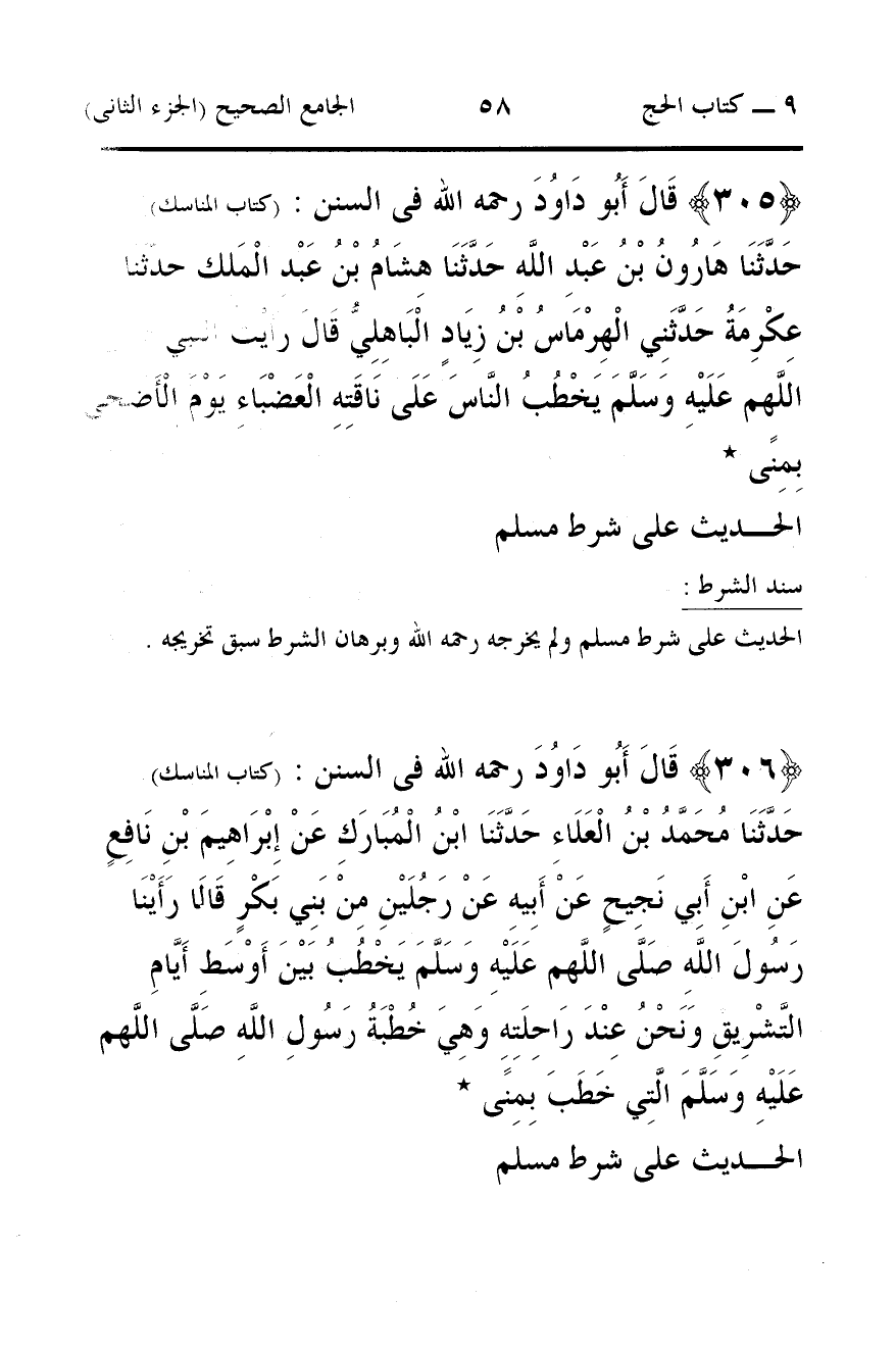306 - قَالَ أَبُو دَاوُدَ رحمه الله فى السنن: (كتاب المناسك) حَدَّثَنَا مُحَمَّدُ بْنُ الْعَلَاءِ حَدَّثَنَا ابْنُ الْمُبَارَكِ عَنْ إِبْرَاهِيمَ بْنِ نَافِعٍ عَنِ ابْنِ أَبِي نَجِيحٍ عَنْ أَبِيهِ عَنْ رَجُلَيْنِ مِنْ بَنِي بَكْرٍ قَالَا رَأَيْنَا رَسُولَ اللَّهِ صَلَّى اللَّهم عَلَيْهِ وَسَلَّمَ يَخْطُبُ بَيْنَ أَوْسَطِ أَيَّامِ التَّشْرِيقِ وَنَحْنُ عِنْدَ رَاحِلَتِهِ وَهِيَ خُطْبَةُ رَسُولِ اللَّهِ صَلَّى اللَّهم عَلَيْهِ وَسَلَّمَ الَّتِي خَطَبَ بِمِنًى *