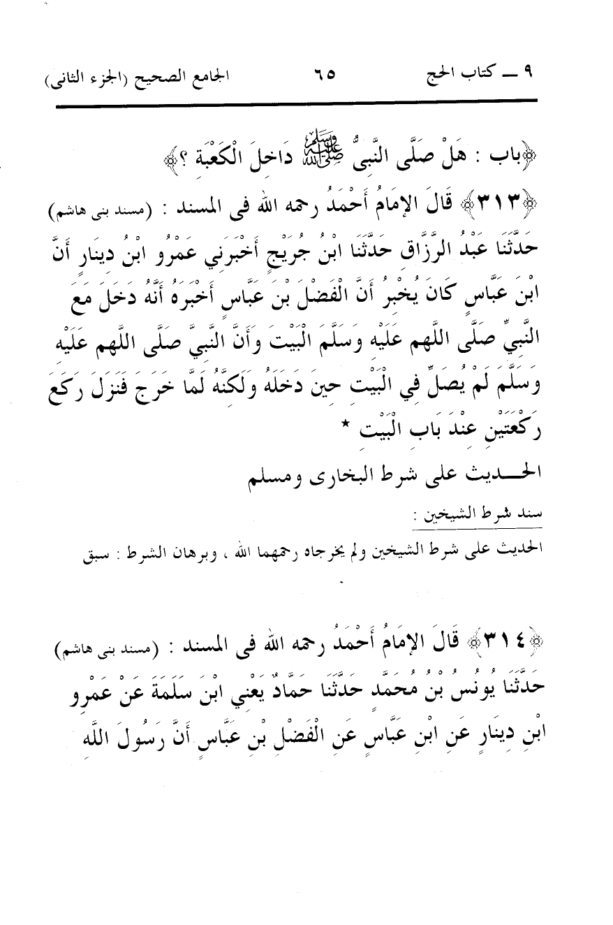 313 - قَالَ الإمَامُ أَحْمَدُ رحمه الله فى المسند: (مسند بنى هاشم) حَدَّثَنَا عَبْدُ الرَّزَّاقِ حَدَّثَنَا ابْنُ جُرَيْجٍ أَخْبَرَنِي عَمْرُو ابْنُ دِينَارٍ أَنَّ ابْنَ عَبَّاسٍ كَانَ يُخْبِرُ أَنَّ الْفَضْلَ بْنَ عَبَّاسٍ أَخْبَرَهُ أَنَّهُ دَخَلَ مَعَ النَّبِيِّ صَلَّى اللَّهم عَلَيْهِ وَسَلَّمَ الْبَيْتَ وَأَنَّ النَّبِيَّ صَلَّى اللَّهم عَلَيْهِ وَسَلَّمَ لَمْ يُصَلِّ فِي الْبَيْتِ حِينَ دَخَلَهُ وَلَكِنَّهُ لَمَّا خَرَجَ فَنَزَلَ رَكَعَ رَكْعَتَيْنِ عِنْدَ بَابِ الْبَيْتِ *