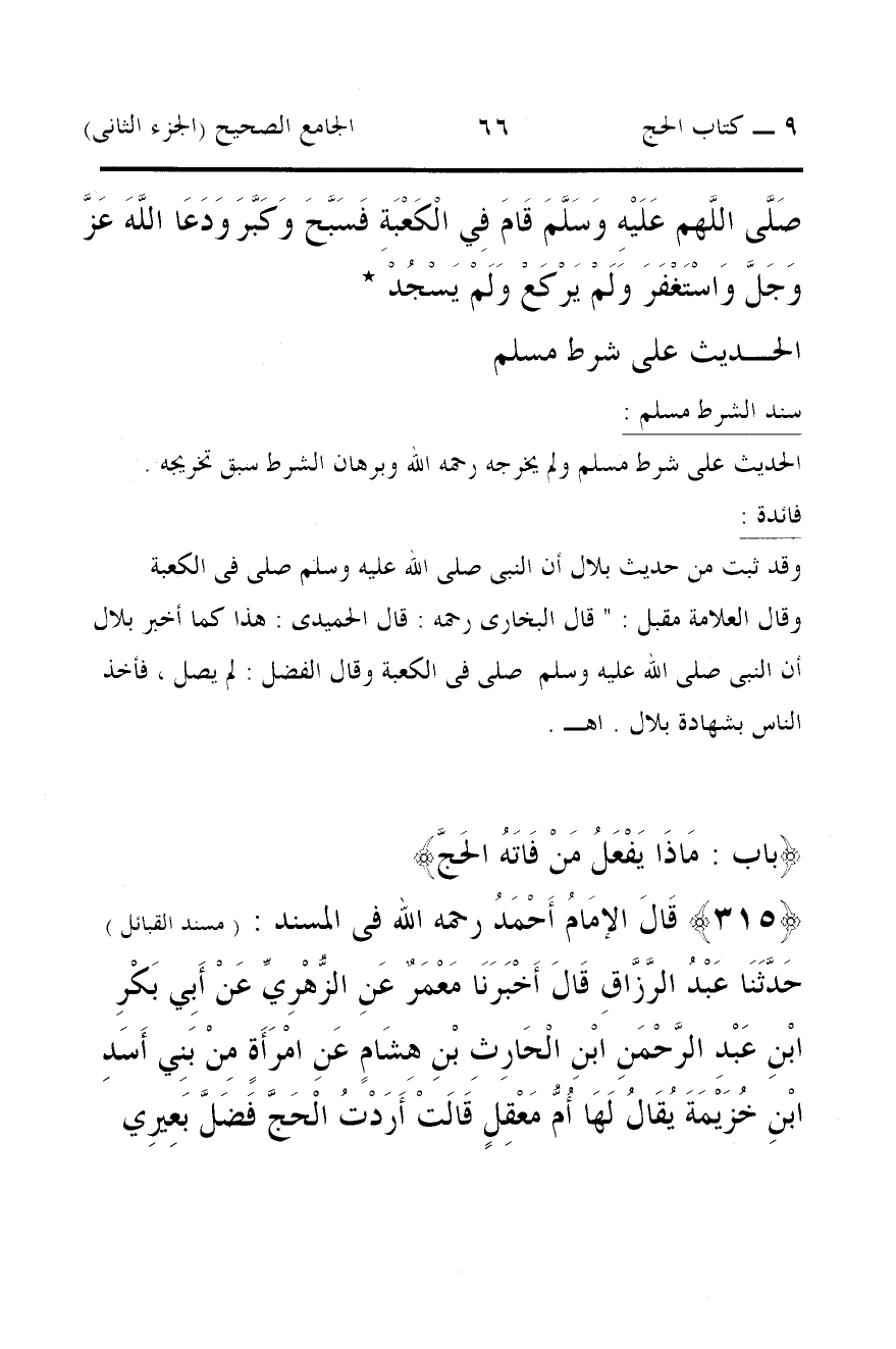 وقال العلامة مقبل: " قال البخارى رحمه: قال الحميدى: هذا كما أخبر بلال أن النبى صلى الله عليه وسلم صلى فى الكعبة وقال الفضل: لم يصل، فأخذ الناس بشهادة بلال. اهـ.