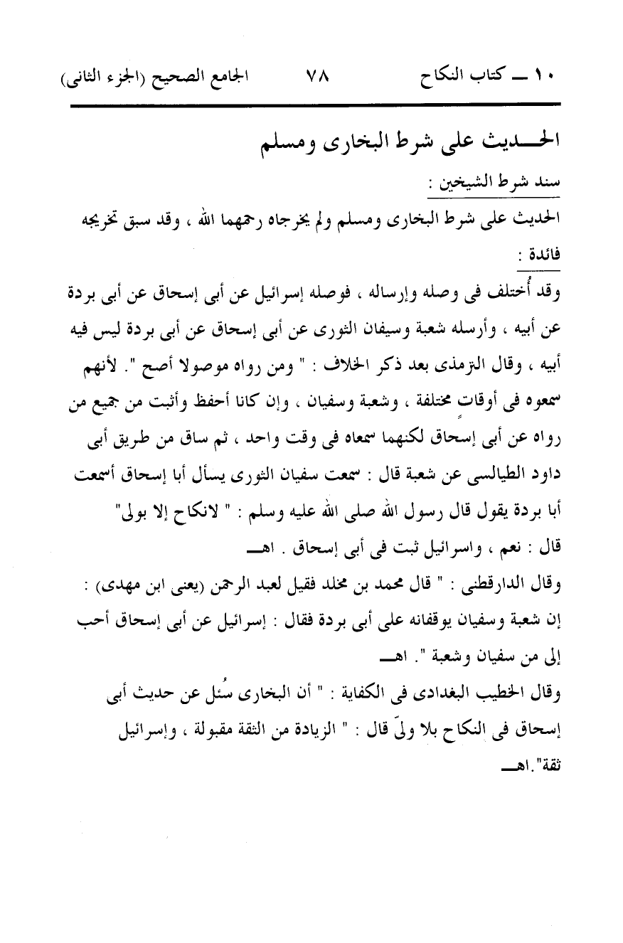 وقال الخطيب البغدادى فى الكفاية: " أن البخارى سُئل عن حديث أبى إسحاق فى النكاح بلا ولىّ قال: " الزيادة من الثقة مقبولة، وإسرائيل ثقة".اهـ