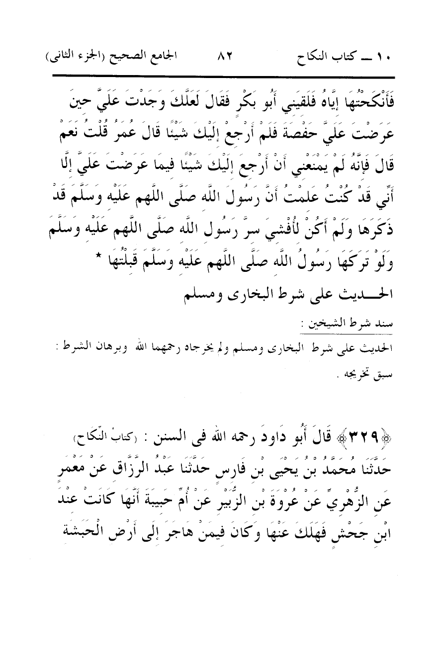 329 - قَالَ أَبُو دَاودَ رحمه الله فى السنن: (كتابُ النِّكَاحِ) حَدَّثَنَا مُحَمَّدُ بْنُ يَحْيَى بْنِ فَارِسٍ حَدَّثَنَا عَبْدُ الرَّزَّاقِ عَنْ مَعْمَرٍ عَنِ الزُّهْرِيِّ عَنْ عُرْوَةَ بْنِ الزُّبَيْرِ عَنْ أُمِّ حَبِيبَةَ أَنَّهَا كَانَتْ عِنْدَ ابْنِ جَحْشٍ فَهَلَكَ عَنْهَا وَكَانَ فِيمَنْ هَاجَرَ إِلَى أَرْضِ الْحَبَشَةِ