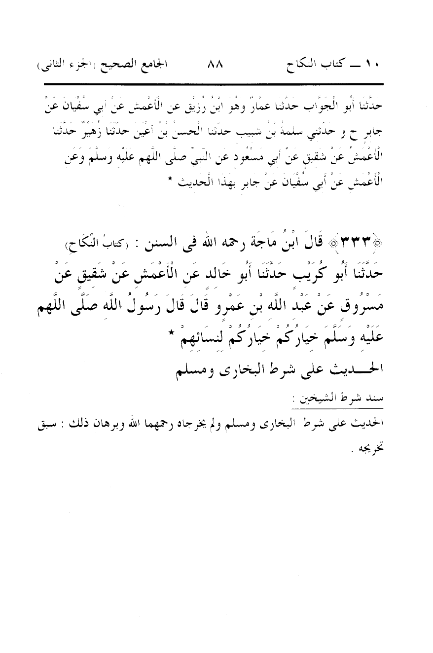 333 - قَالَ ابْنُ مَاجَة رحمه الله فى السنن: (كتابُ النِّكَاحِ) حَدَّثَنَا أَبُو كُرَيْبٍ حَدَّثَنَا أَبُو خَالِدٍ عَنِ الْأَعْمَشِ عَنْ شَقِيقٍ عَنْ مَسْرُوقٍ عَنْ عَبْدِ اللَّهِ بْنِ عَمْرٍو قَالَ قَالَ رَسُولُ اللَّهِ صَلَّى اللَّهم عَلَيْهِ وَسَلَّمَ خِيَارُكُمْ خِيَارُكُمْ لِنِسَائِهِمْ *