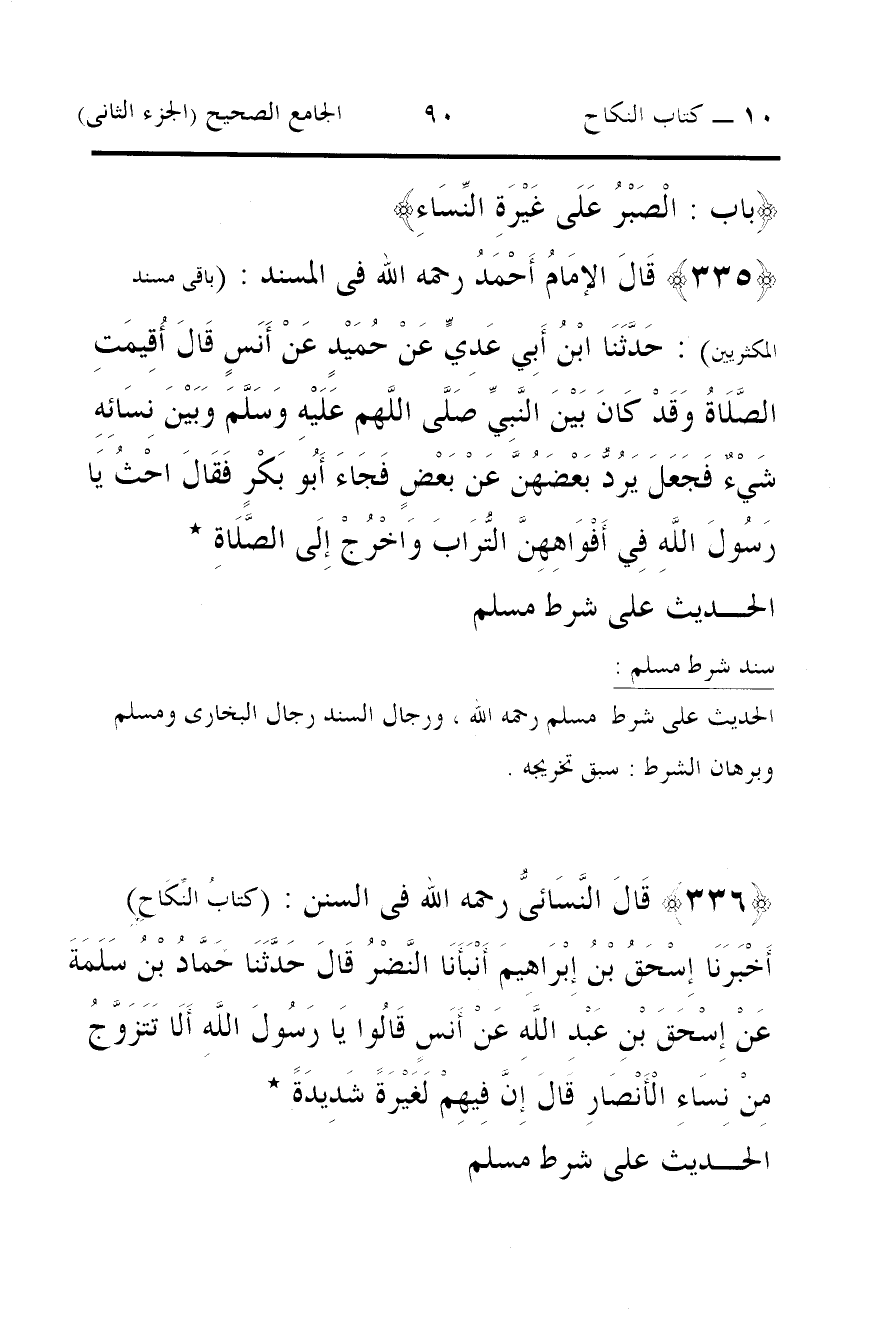 336 - قَالَ النَّسَائىُّ رحمه الله فى السنن: (كتابُ النِّكَاحِ) أَخْبَرَنَا إِسْحَقُ بْنُ إِبْرَاهِيمَ أَنْبَأَنَا النَّضْرُ قَالَ حَدَّثَنَا حَمَّادُ بْنُ سَلَمَةَ عَنْ إِسْحَقَ بْنِ عَبْدِ اللَّهِ عَنْ أَنَسٍ قَالُوا يَا رَسُولَ اللَّهِ أَلَا تَتَزَوَّجُ مِنْ نِسَاءِ الْأَنْصَارِ قَالَ إِنَّ فِيهِمْ لَغَيْرَةً شَدِيدَةً *
