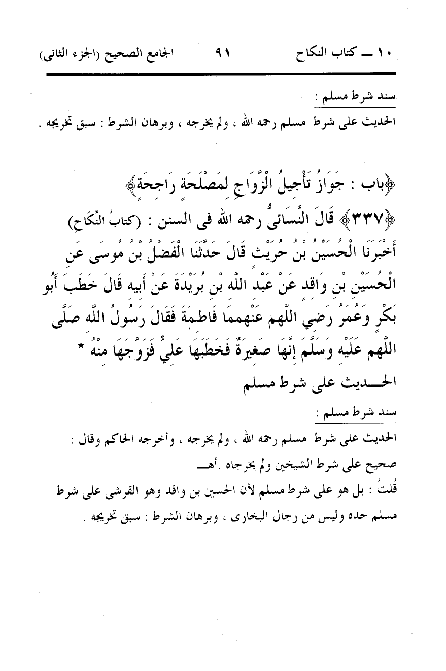 337 - قَالَ النَّسَائىُّ رحمه الله فى السنن: (كتابُ النِّكَاحِ) أَخْبَرَنَا الْحُسَيْنُ بْنُ حُرَيْثٍ قَالَ حَدَّثَنَا الْفَضْلُ بْنُ مُوسَى عَنِ الْحُسَيْنِ بْنِ وَاقِدٍ عَنْ عَبْدِ اللَّهِ بْنِ بُرَيْدَةَ عَنْ أَبِيهِ قَالَ خَطَبَ أَبُو بَكْرٍ وَعُمَرُ رَضِي اللَّهم عَنْهمَا فَاطِمَةَ فَقَالَ رَسُولُ اللَّهِ صَلَّى اللَّهم عَلَيْهِ وَسَلَّمَ إِنَّهَا صَغِيرَةٌ فَخَطَبَهَا عَلِيٌّ فَزَوَّجَهَا مِنْهُ *