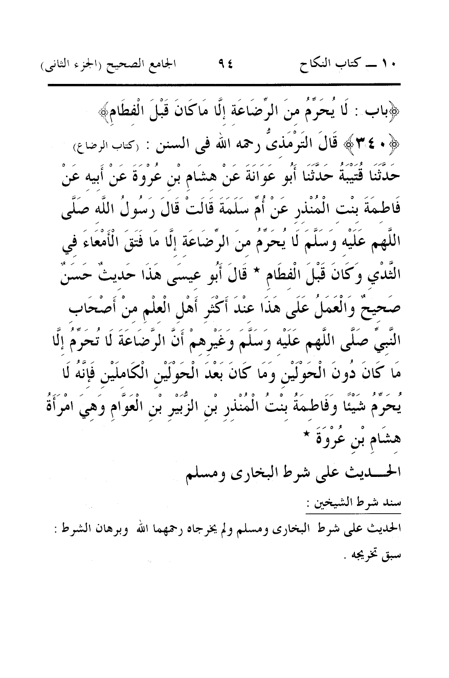 340 - قَالَ التَرْمَذِىُّ رحمه الله فى السنن: (كتاب الرضاع) حَدَّثَنَا قُتَيْبَةُ حَدَّثَنَا أَبُو عَوَانَةَ عَنْ هِشَامِ بْنِ عُرْوَةَ عَنْ أَبِيهِ عَنْ فَاطِمَةَ بِنْتِ الْمُنْذِرِ عَنْ أُمِّ سَلَمَةَ قَالَتْ قَالَ رَسُولُ اللَّهِ صَلَّى اللَّهم عَلَيْهِ وَسَلَّمَ لَا يُحَرِّمُ مِنَ الرِّضَاعَةِ إِلَّا مَا فَتَقَ الْأَمْعَاءَ فِي الثَّدْيِ وَكَانَ قَبْلَ الْفِطَامِ * قَالَ أَبُو عِيسَى هَذَا حَدِيثٌ حَسَنٌ صَحِيحٌ وَالْعَمَلُ عَلَى هَذَا عِنْدَ أَكْثَرِ أَهْلِ الْعِلْمِ مِنْ أَصْحَابِ النَّبِيِّ صَلَّى اللَّهم عَلَيْهِ وَسَلَّمَ وَغَيْرِهِمْ أَنَّ الرَّضَاعَةَ لَا تُحَرِّمُ إِلَّا مَا كَانَ دُونَ الْحَوْلَيْنِ وَمَا كَانَ بَعْدَ الْحَوْلَيْنِ الْكَامِلَيْنِ فَإِنَّهُ لَا يُحَرِّمُ شَيْئًا وَفَاطِمَةُ بِنْتُ الْمُنْذِرِ بْنِ الزُّبَيْرِ بْنِ الْعَوَّامِ وَهِيَ امْرَأَةُ هِشَامِ بْنِ عُرْوَةَ *