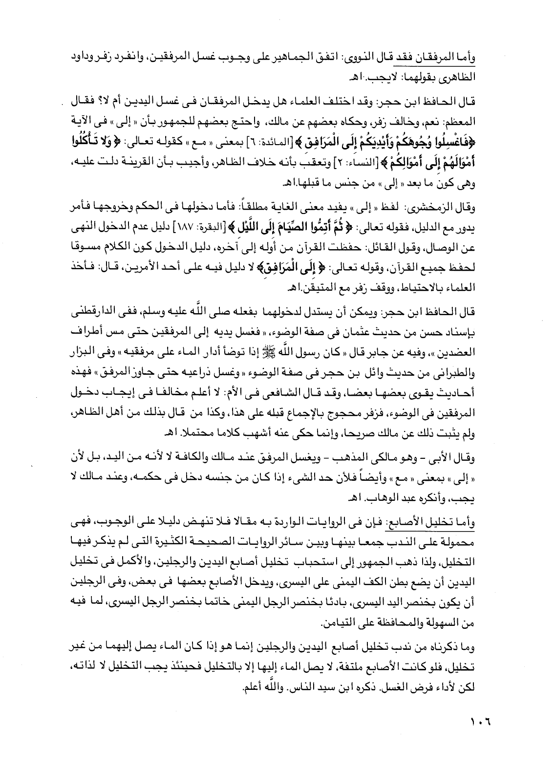 قال الحافظ ابن حجر: ويمكن أن يستدل لدخولهما بفعله صلى الله عليه وسلم، ففي الدارقطني بإسناد حسن من حديث عثمان في صفة الوضوء، "فغسل يديه إلى المرفقين حتى مس أطراف العضدين"، وفيه عن جابر قال "كان رسول الله صلى الله عليه وسلم إذا توضأ أدار الماء على مرفقيه" وفي البزار والطبراني من حديث وائل بن حجر في صفة الوضوء "وغسل ذراعيه حتى جاوز المرفق" فهذه أحاديث يقوي بعضها بعضا، وقد قال الشافعي في الأم: لا أعلم مخالفا في إيجاب دخول المرفقين في الوضوء، فزفر محجوج بالإجماع قبله على هذا، وكذا من قال بذلك من أهل الظاهر، ولم يثبت ذلك عن مالك صريحا، وإنما حكى عنه أشهب كلاما محتملا. اهـ.