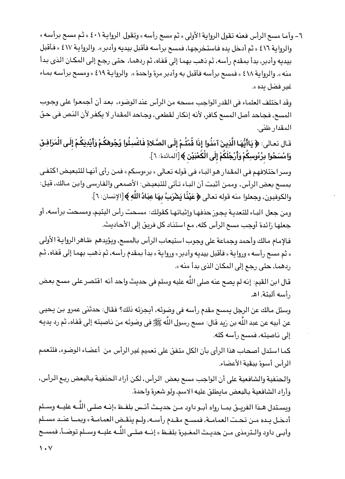 6 - وأما مسح الرأس فعنه تقول الرواية الأولى "ثم مسح رأسه" وتقول الرواية 401 "ثم مسح برأسه" والرواية 416 "ثم أدخل يده فاستخرجها، فمسح برأسه فأقبل بيديه وأدبر". والرواية 417 "فأقبل بيديه وأدبر، بدأ بمقدم رأسه، ثم ذهب بهما إلى قفاه، ثم ردهما، حتى رجع إلى المكان الذي بدأ منه". والرواية 418 "فمسح برأسه فأقبل به وأدبر مرة واحدة". والرواية 419 "ومسح برأسه بماء غير فضل يده".