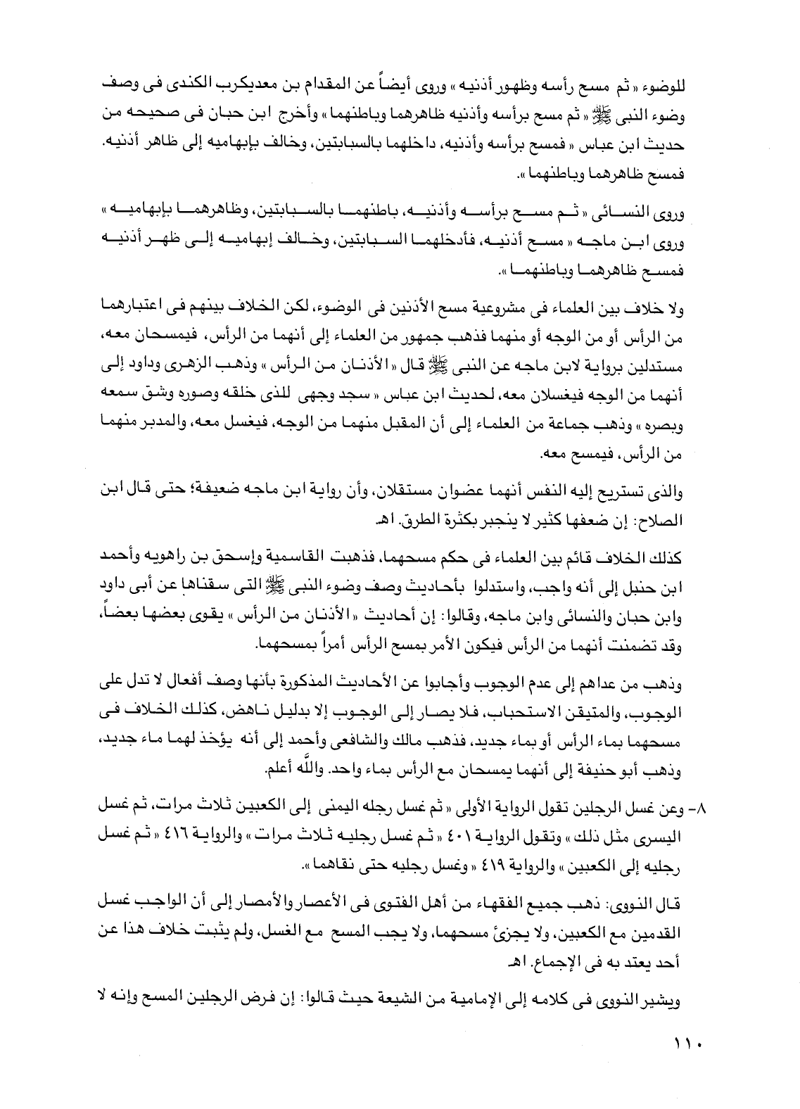 وذهب من عداهم إلى عدم الوجوب وأجابوا عن الأحاديث المذكورة بأنها وصف أفعال لا تدل على الوجوب، والمتيقن الاستحباب، فلا يصار إلى الوجوب إلا بدليل ناهض، كذلك الخلاف في مسحهما بماء الرأس أو بماء جديد، فذهب مالك والشافعي وأحمد إلى أنه يؤخذ لهما ماء جديد، وذهب أبو حنيفة إلى أنهما يمسحان مع الرأس بماء واحد. والله أعلم.