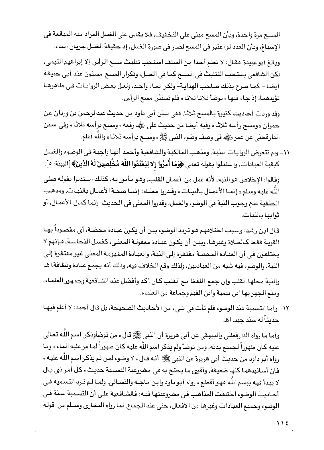 11 - ولم تتعرض الروايات للنية، ومذهب المالكية والشافعية وأحمد أنها واجبة في الوضوء والغسل كبقية العبادات، واستدلوا بقوله تعالى {وما أمروا إلا ليعبدوا الله مخلصين له الدين} [البينة: 5].