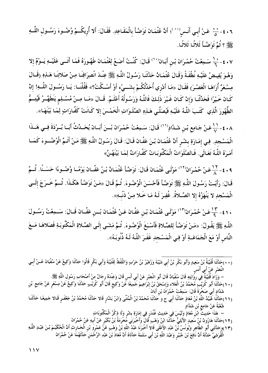 408 - عن جامع بن شداد قال: سمعت حمران بن أبان يحدث أبا بردة في هذا المسجد. في إمارة بشر أن عثمان بن عفان قال: قال رسول الله صلى الله عليه وسلم من أتم الوضوء كما أمره الله تعالى. فالصلوات المكتوبات كفارات لما بينهن"